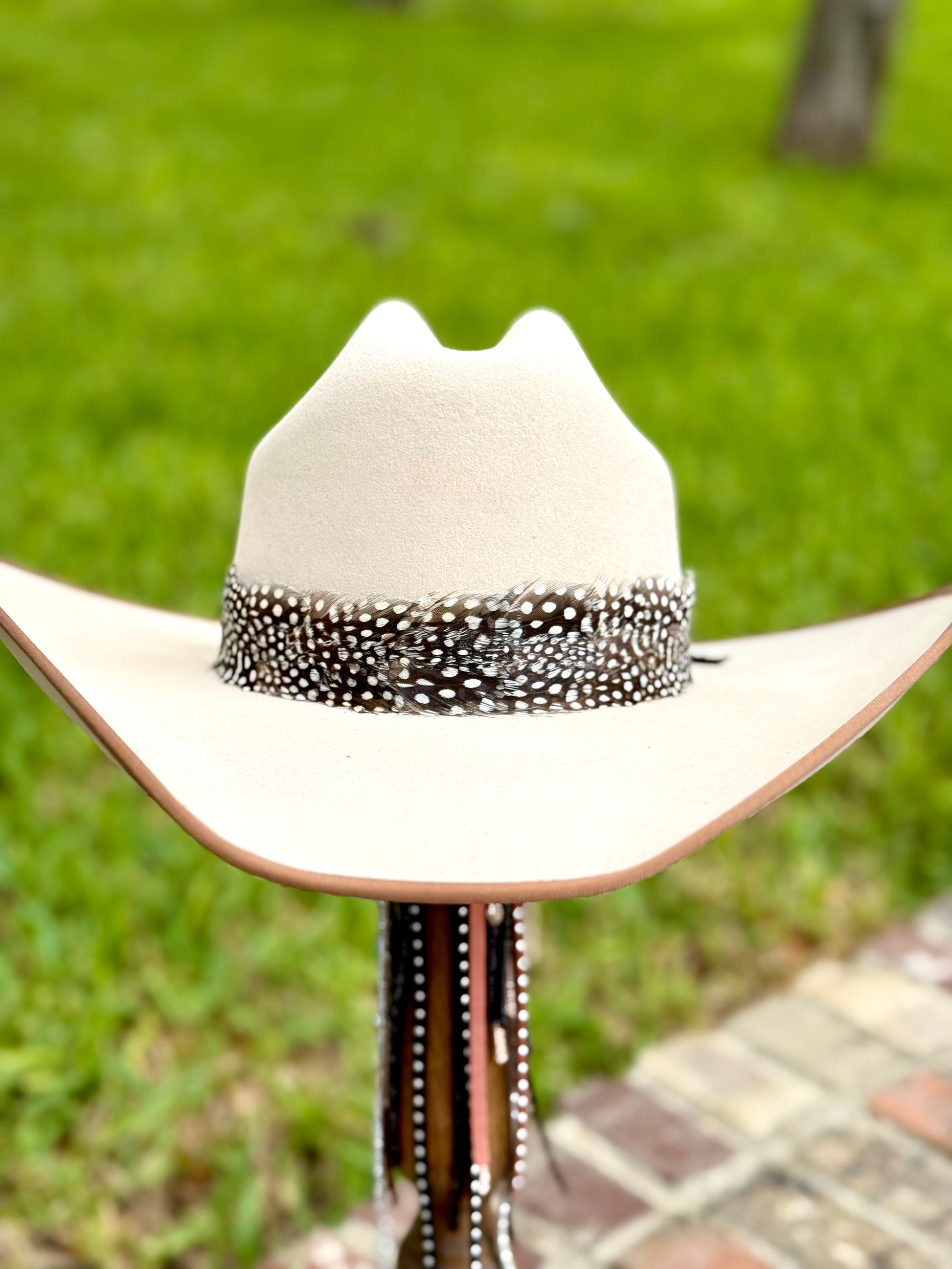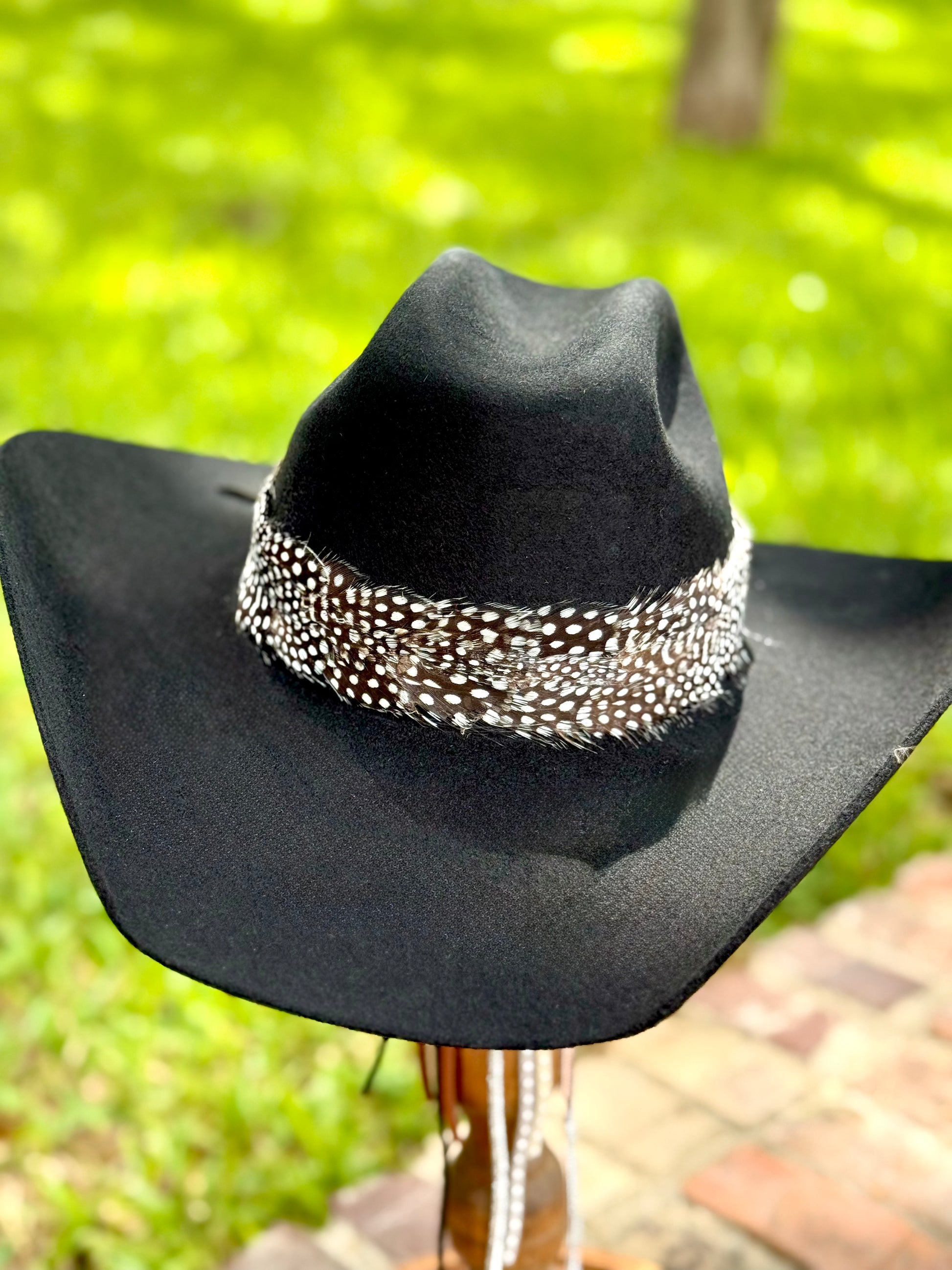 This beautiful guinea feather hatband gives retro vibes. Hand-made feather hatband is adjustable and will fit any hat. Easy to take off or move between hats.