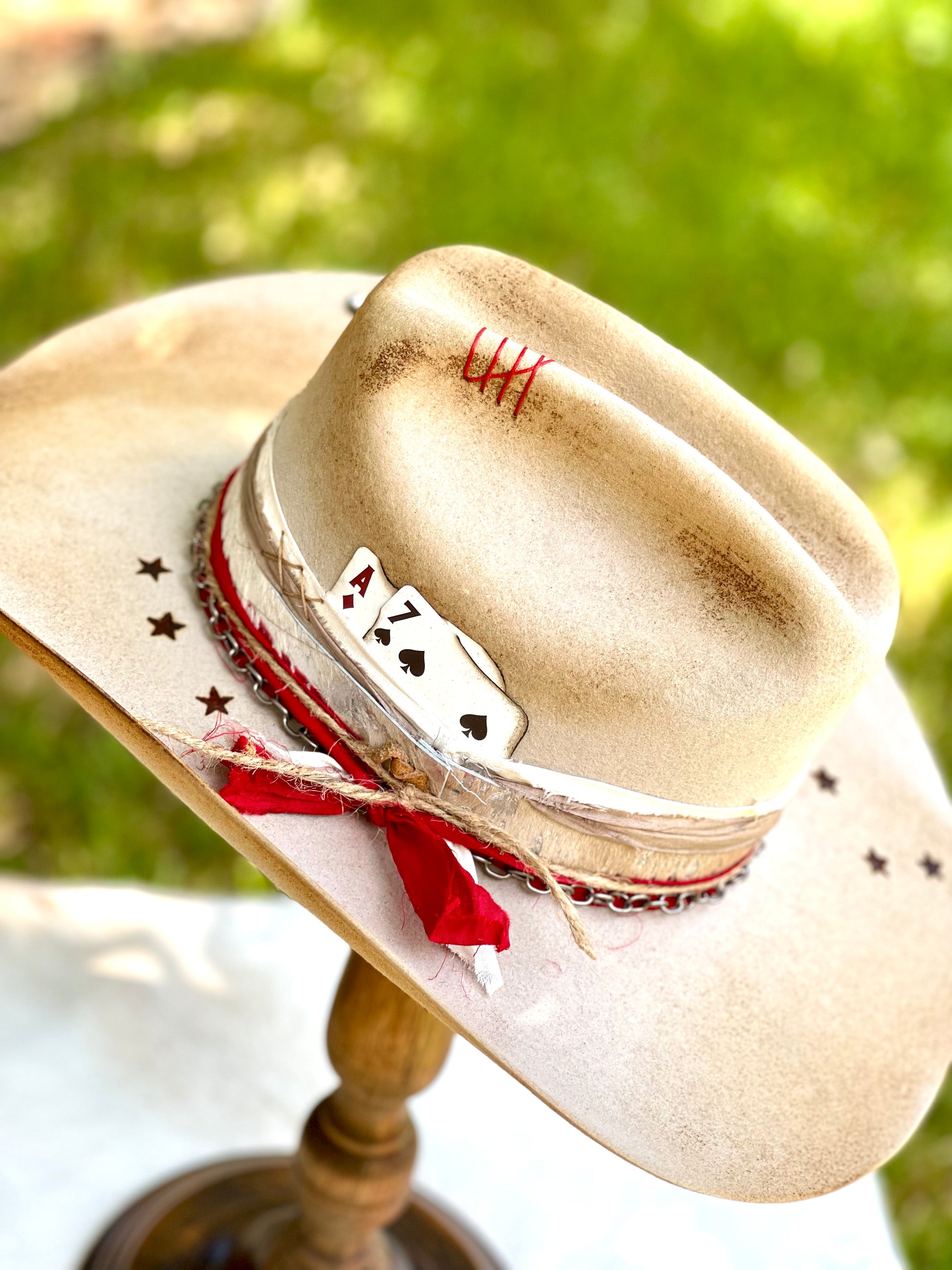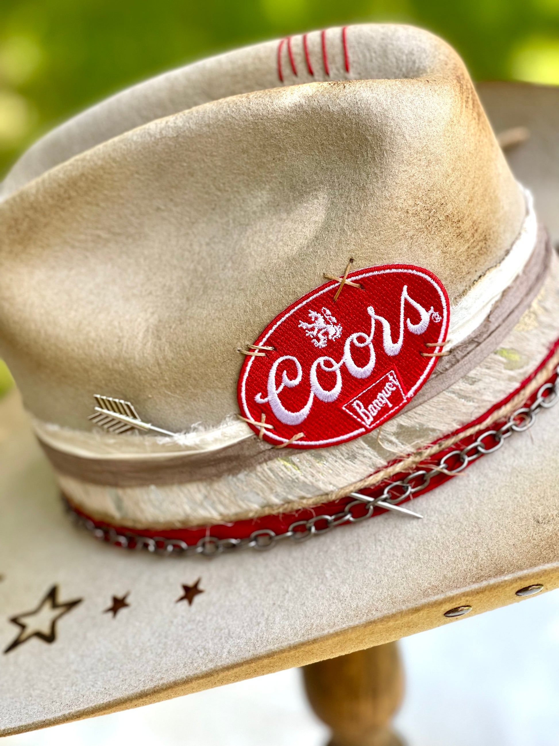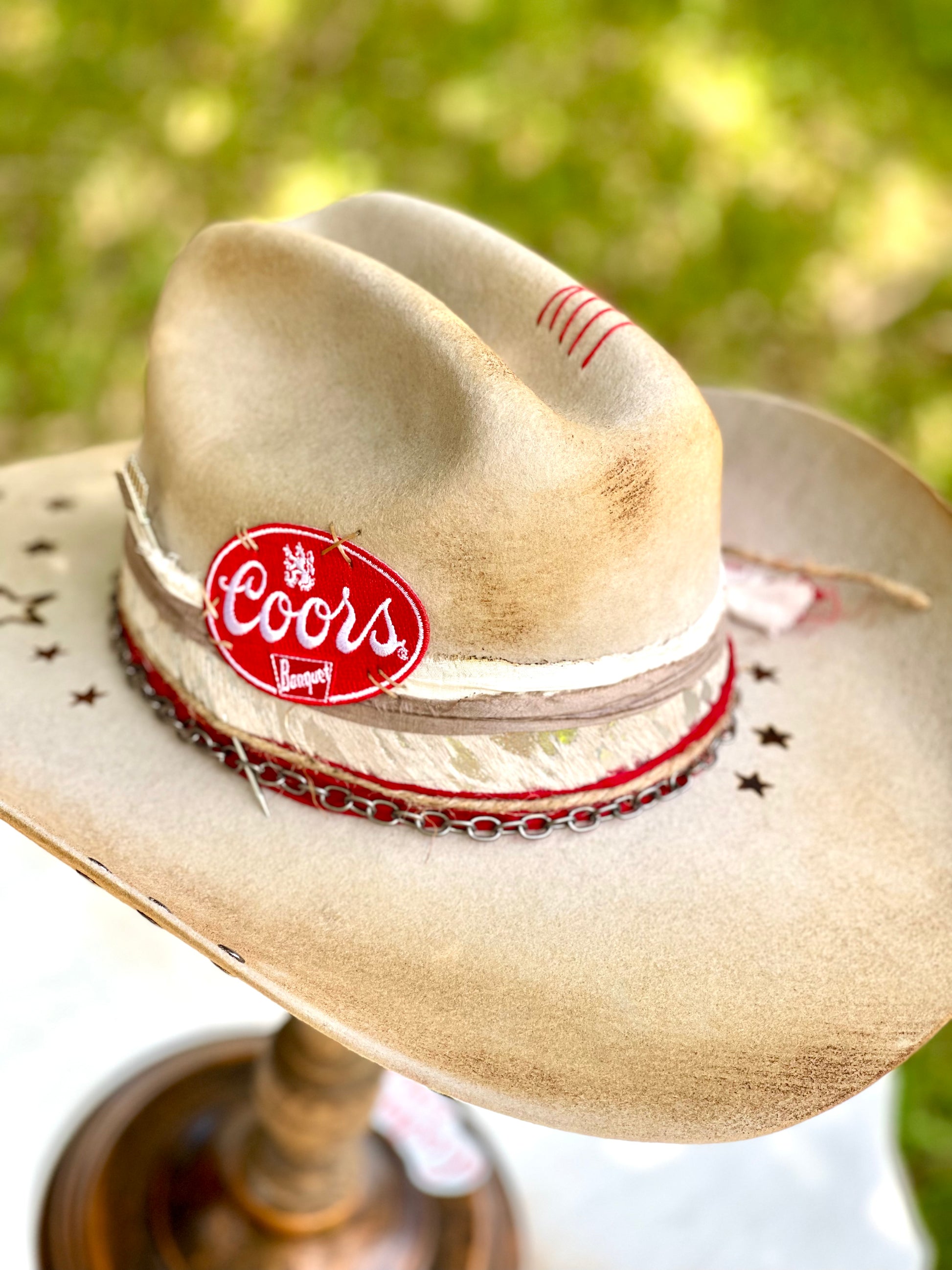 Gorgeous customized cowboy hat. Cream (with slight silver gray tint) cowboy hat with rustic distressing, branding, pins/charms, brim candy, playing cards and Coors patch.