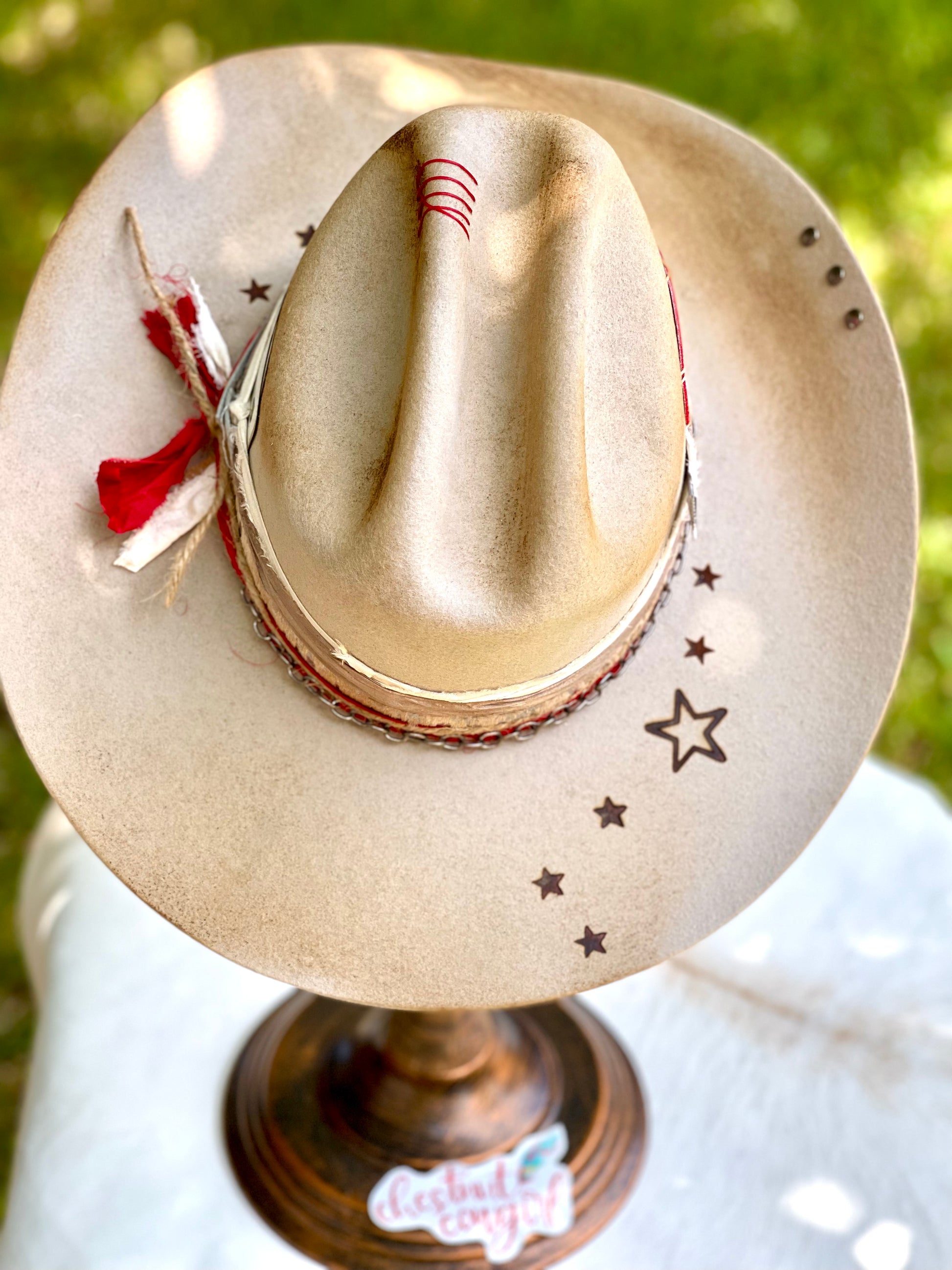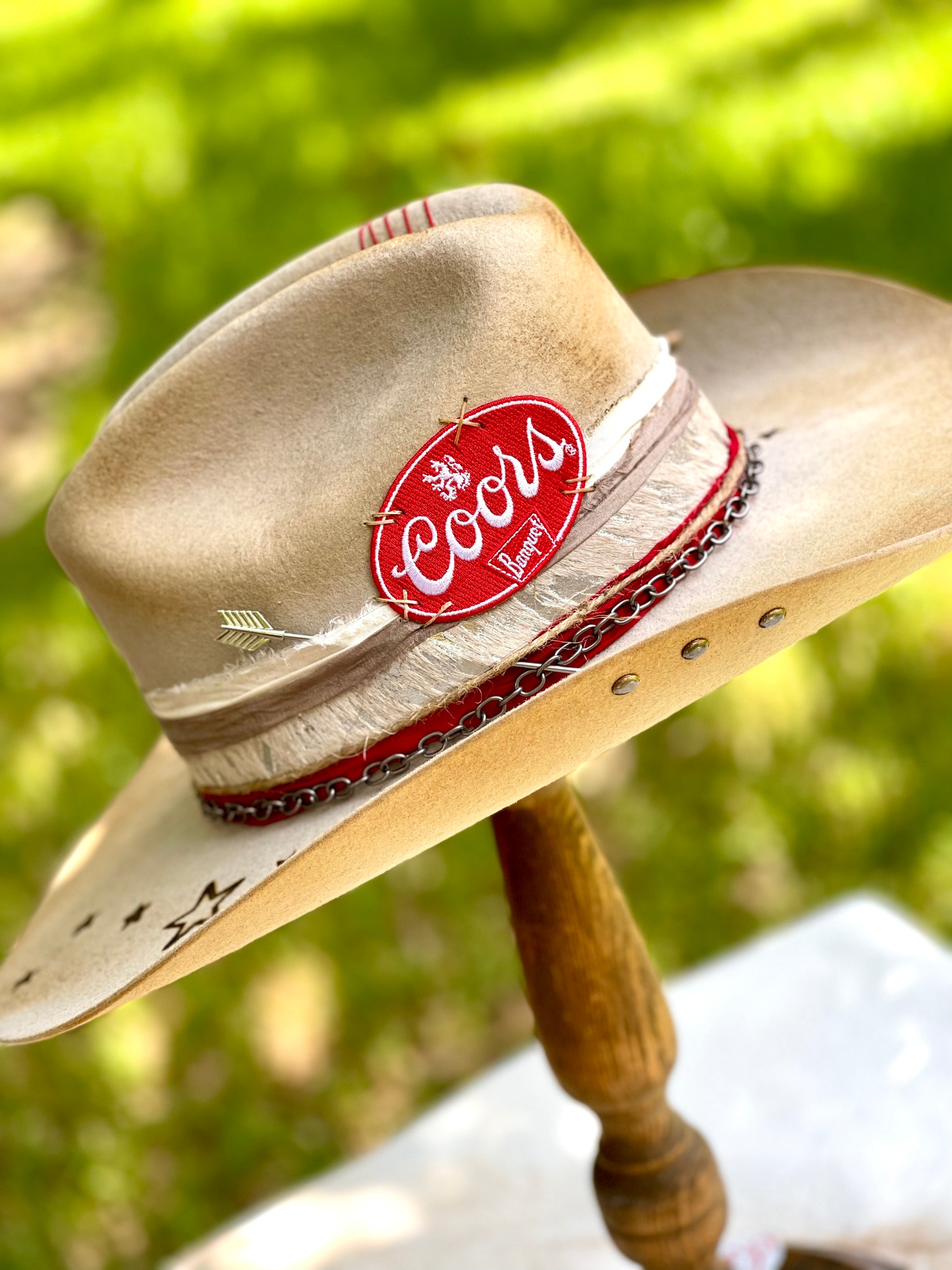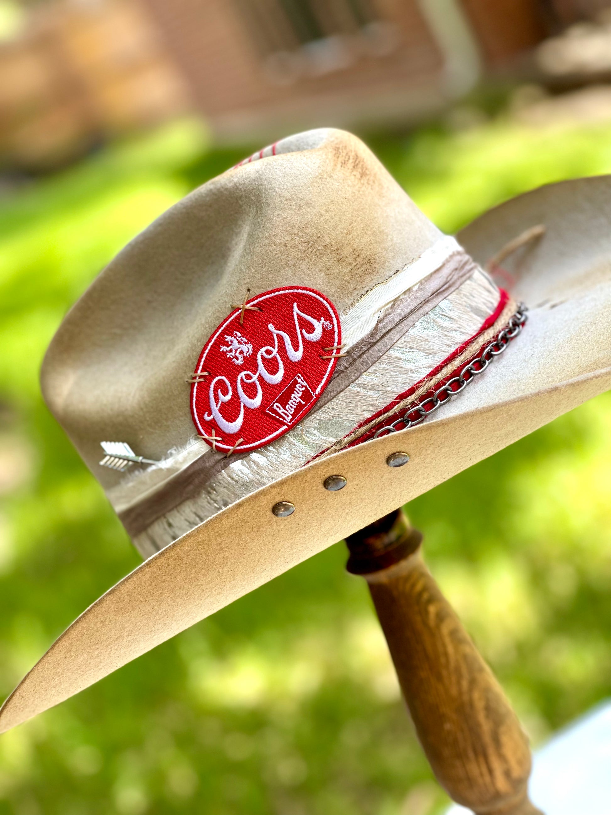 Gorgeous customized cowboy hat. Cream (with slight silver gray tint) cowboy hat with rustic distressing, branding, pins/charms, brim candy, playing cards and Coors patch.