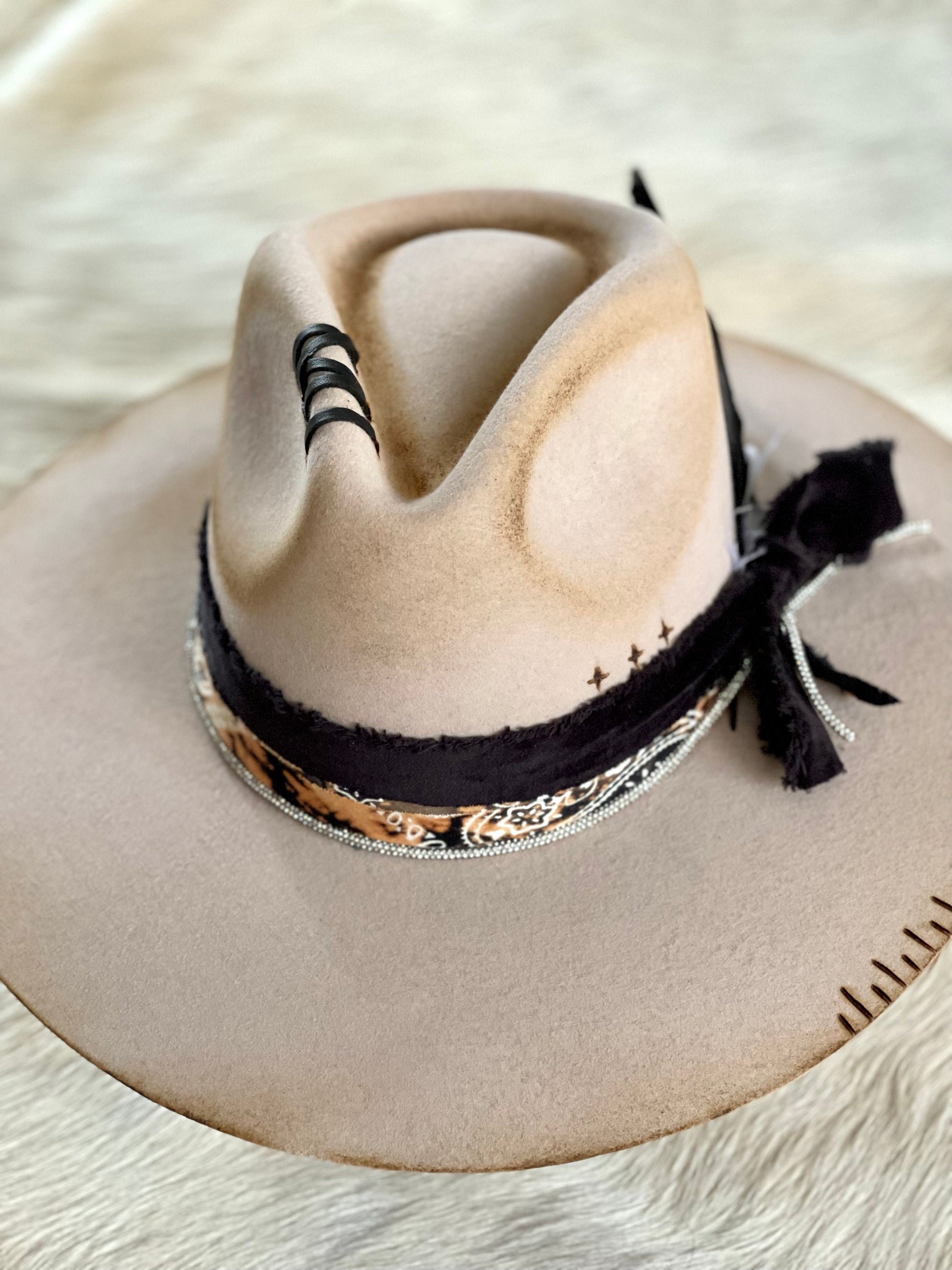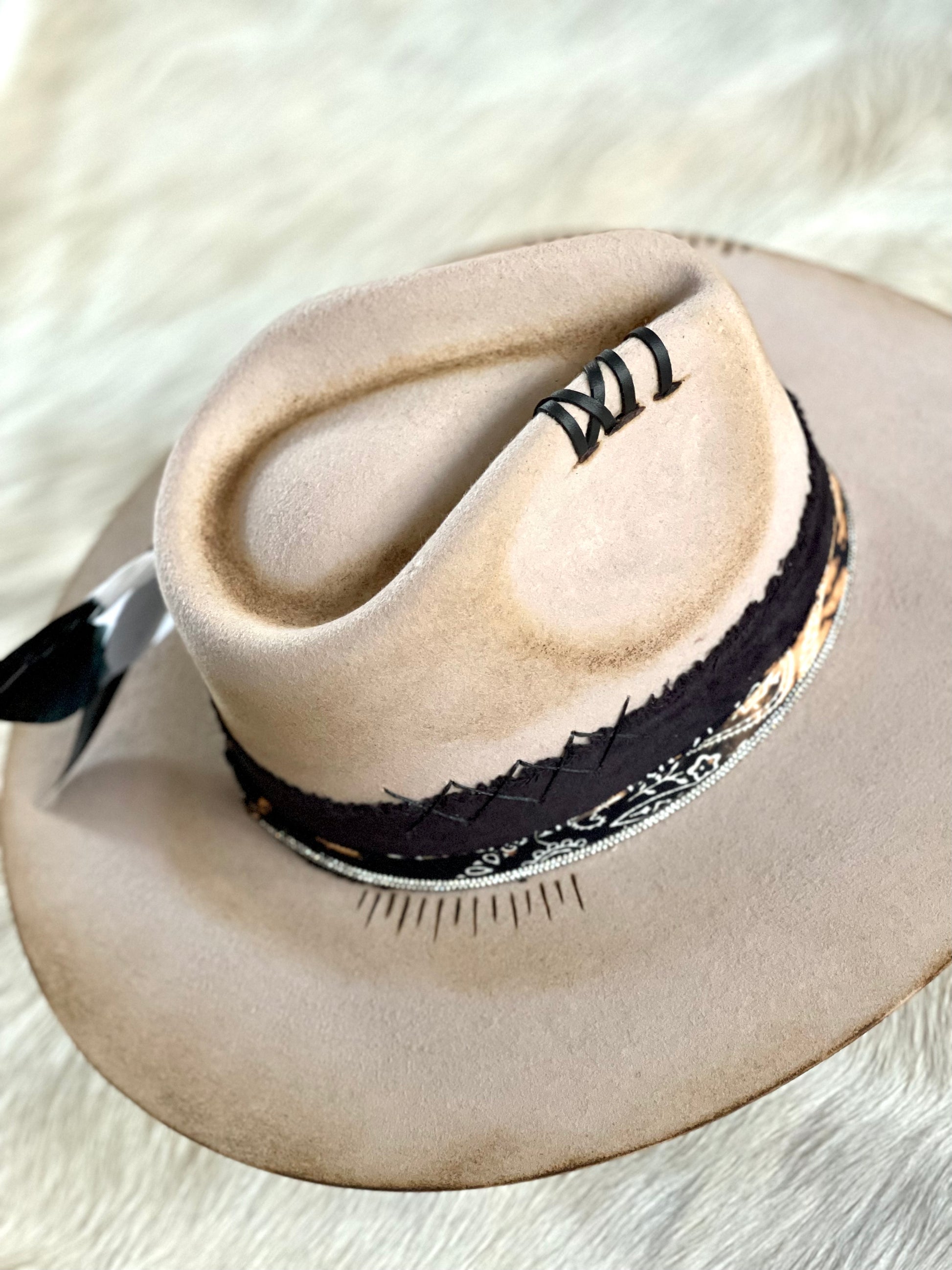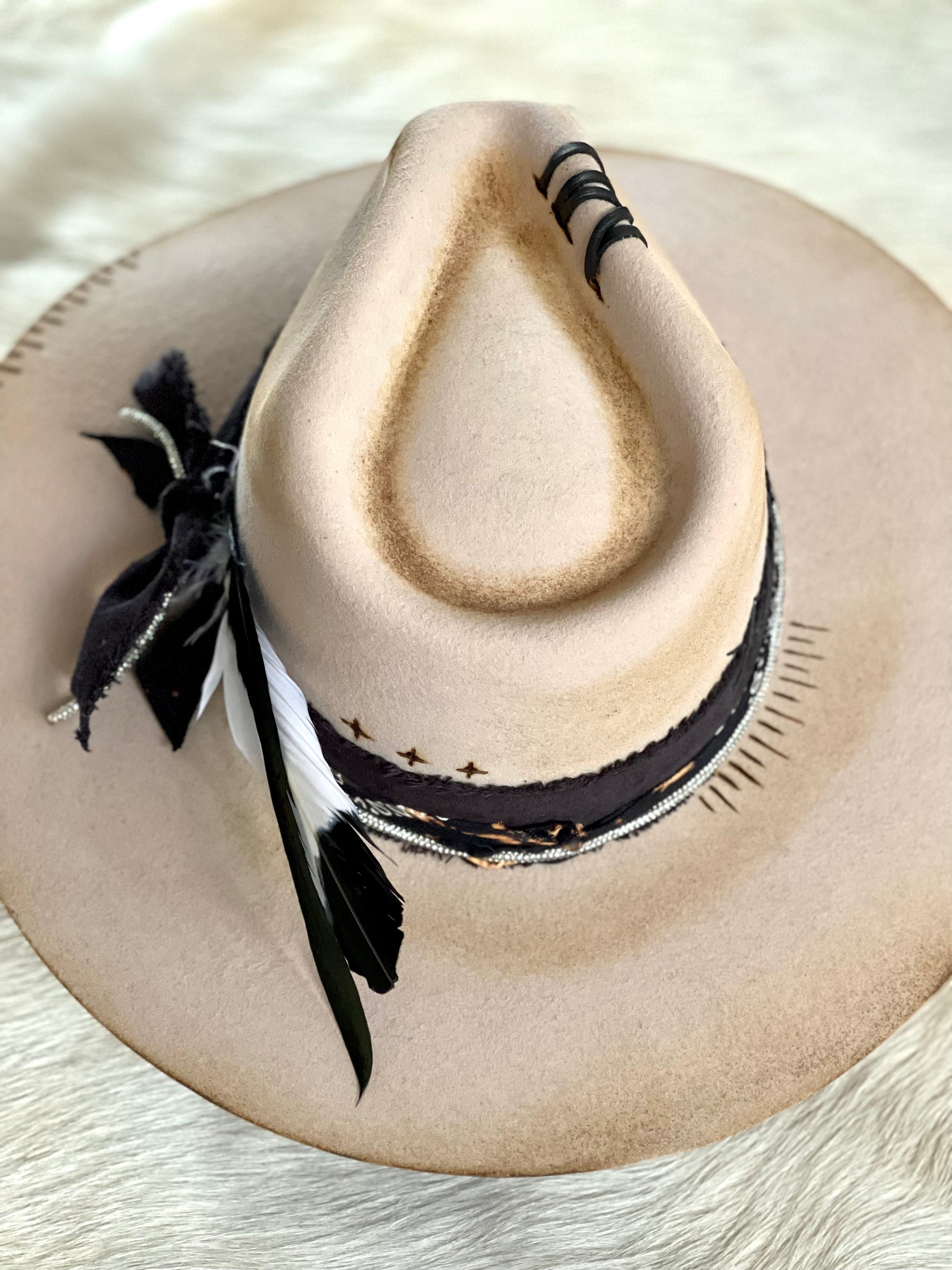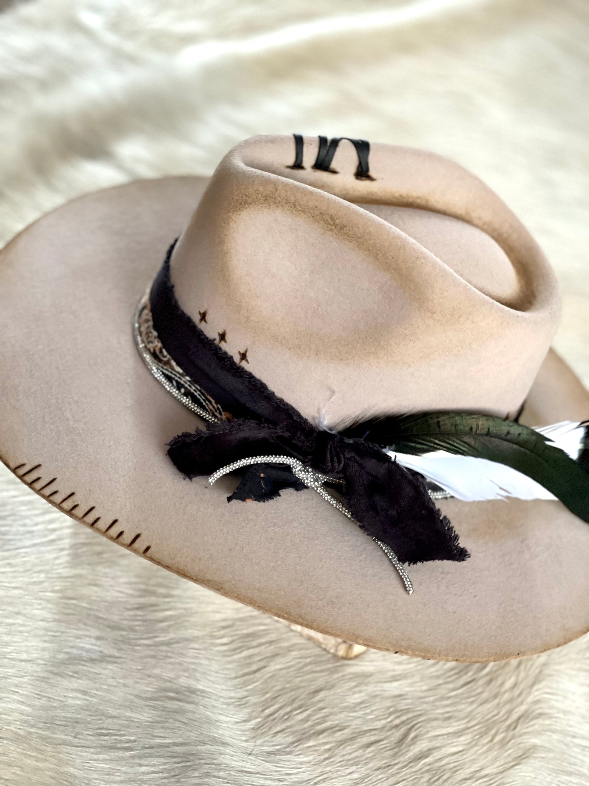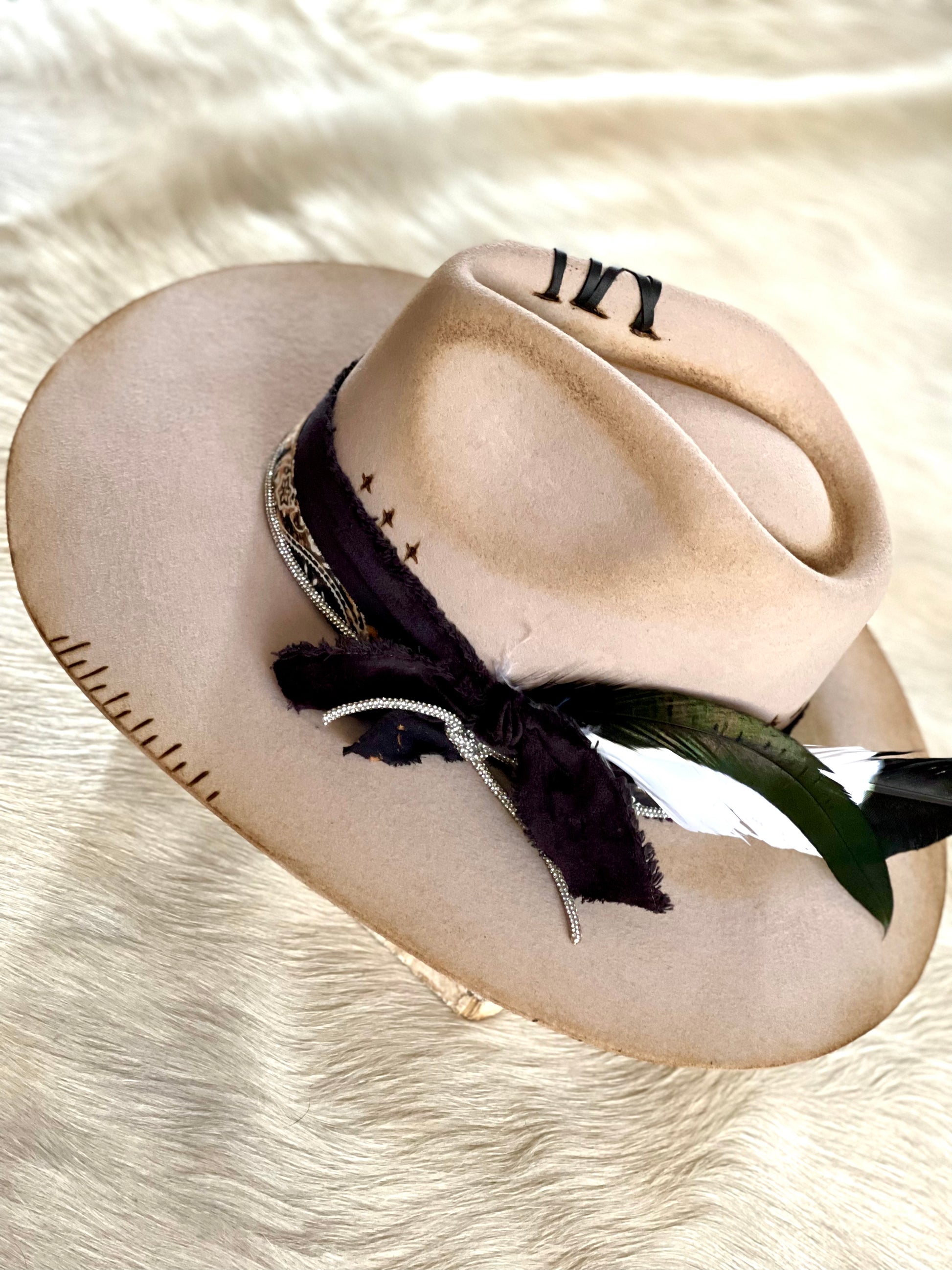 Gorgeous customized western fashion hat. Beautiful and bold distressed design with accent stitching and feathers.