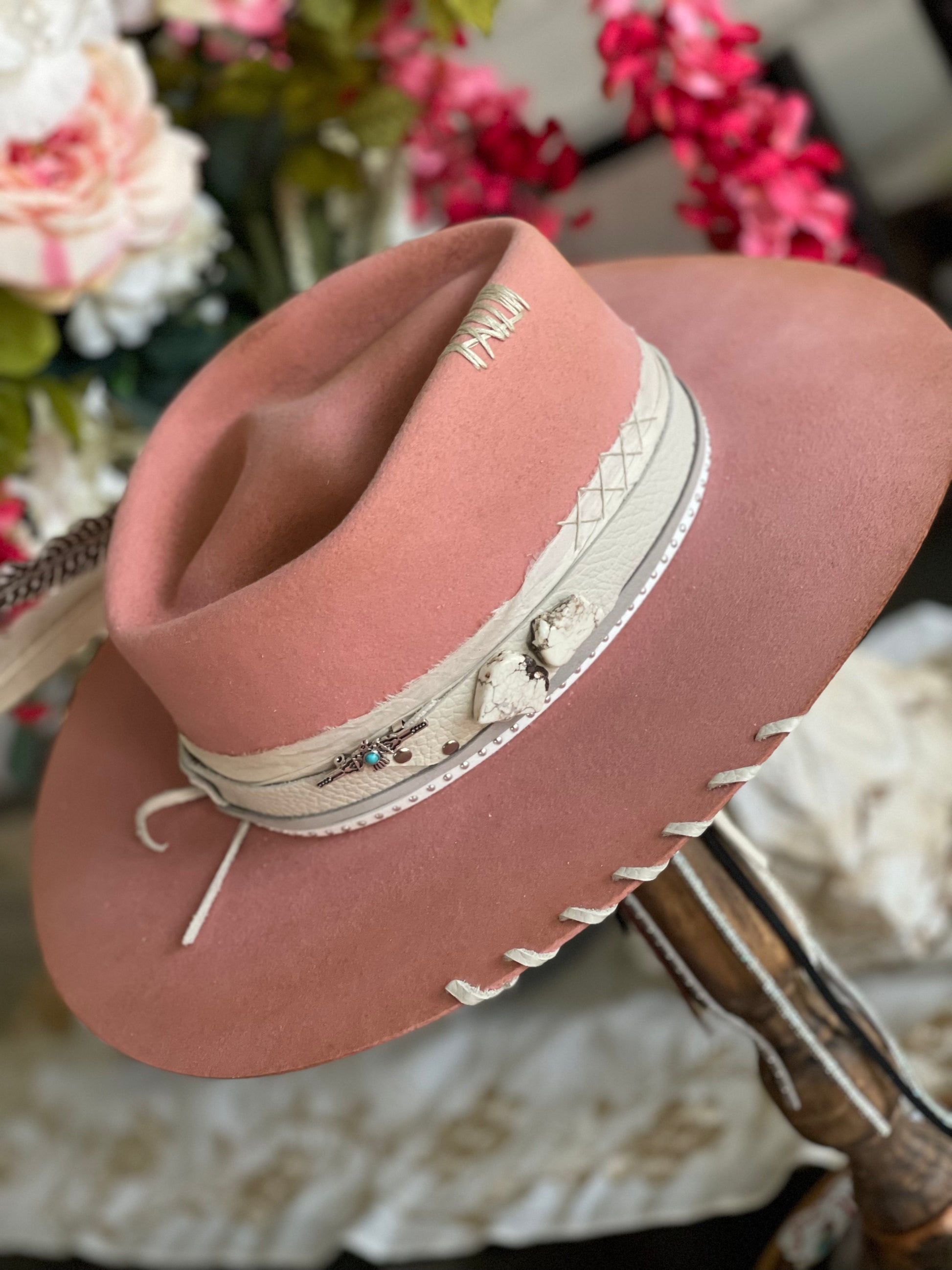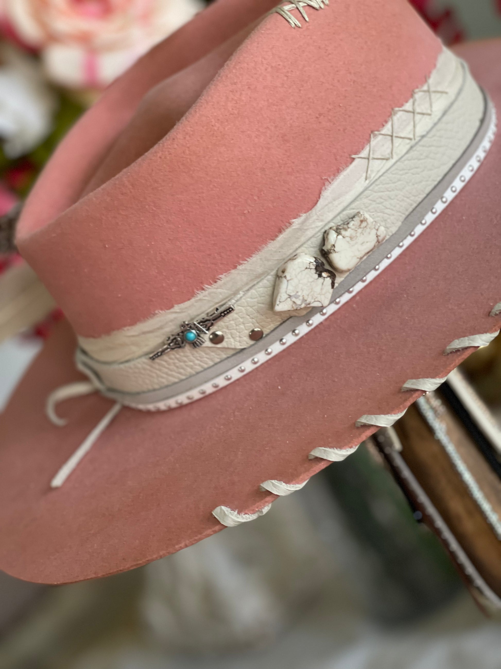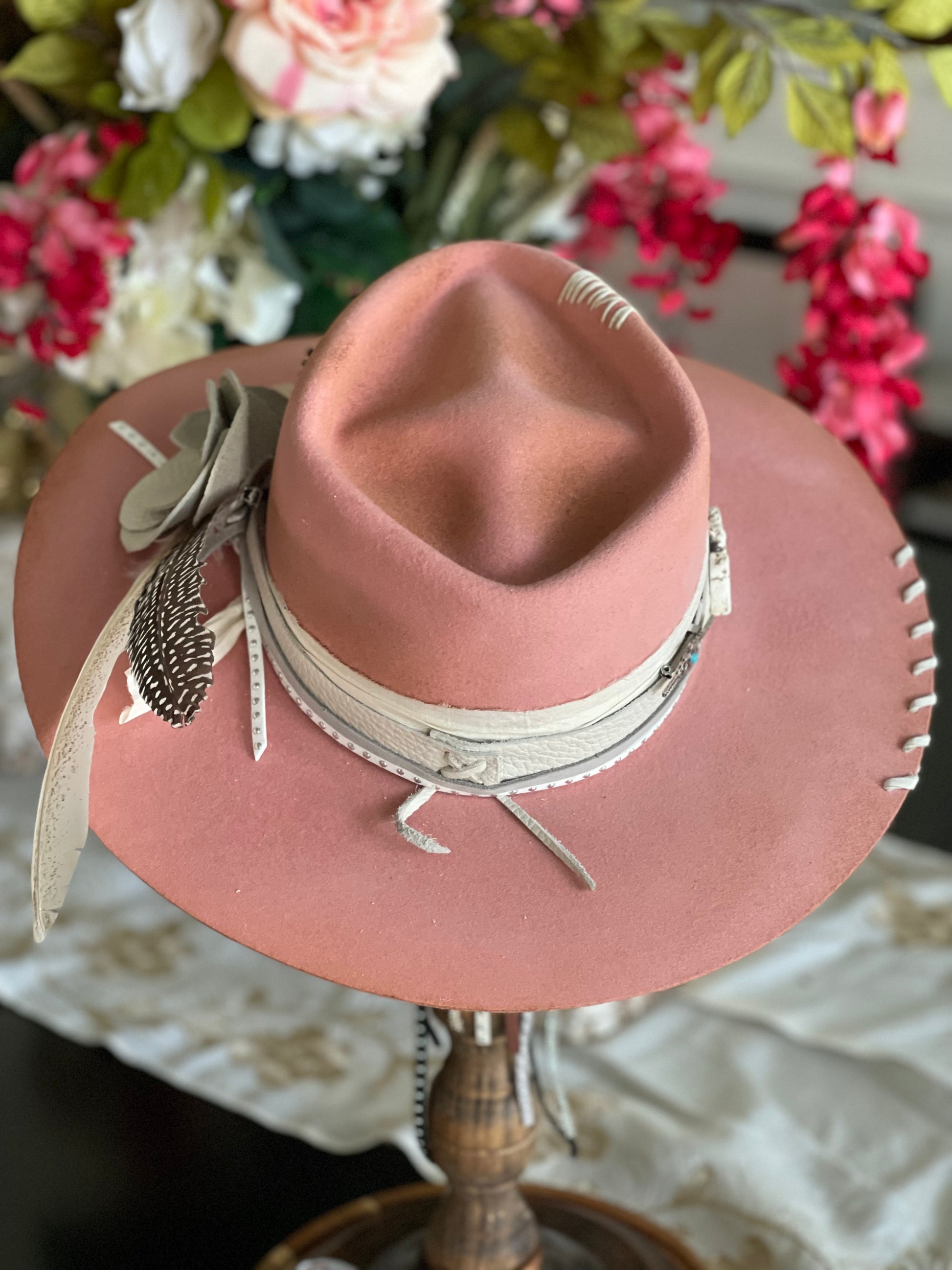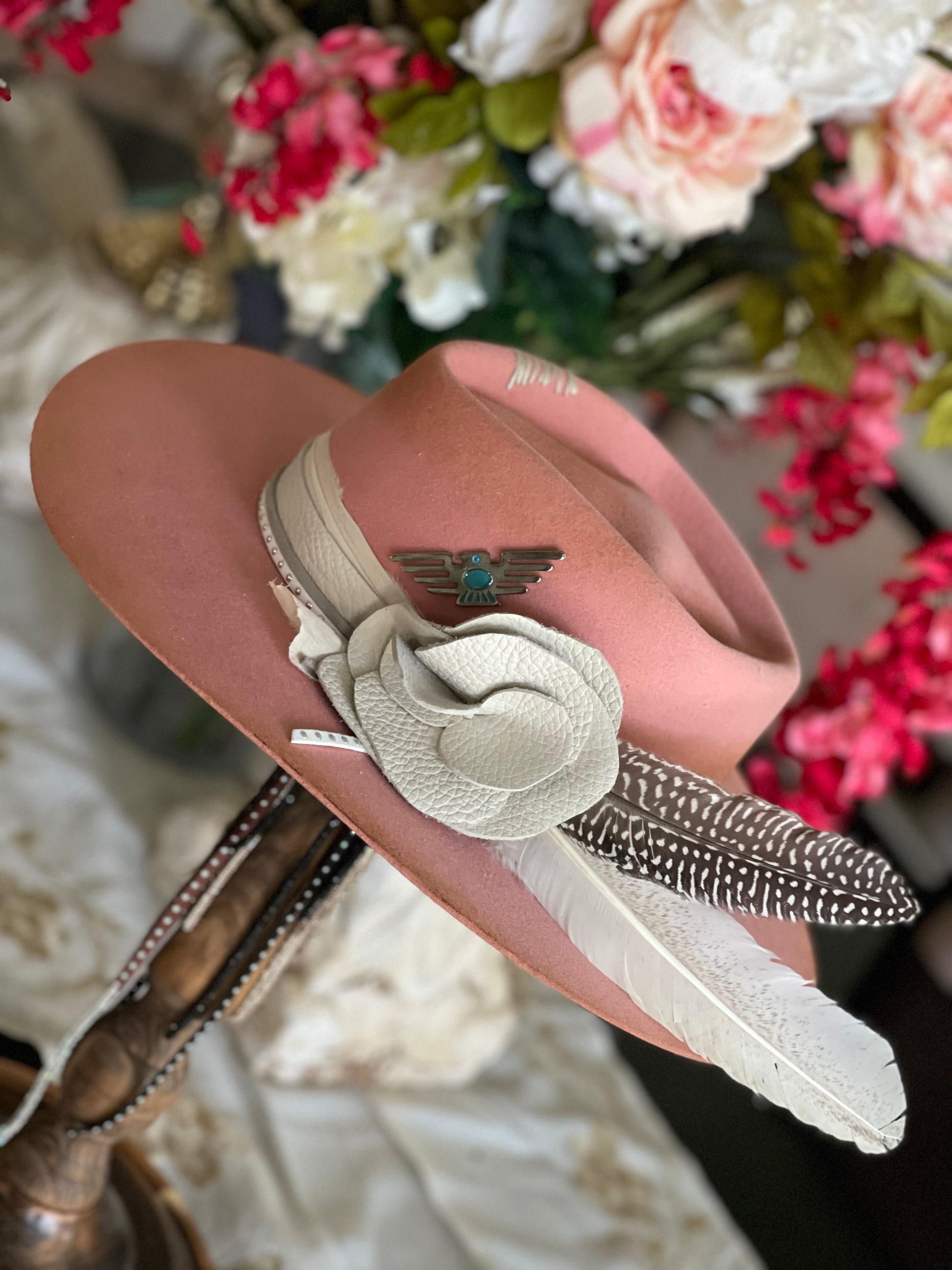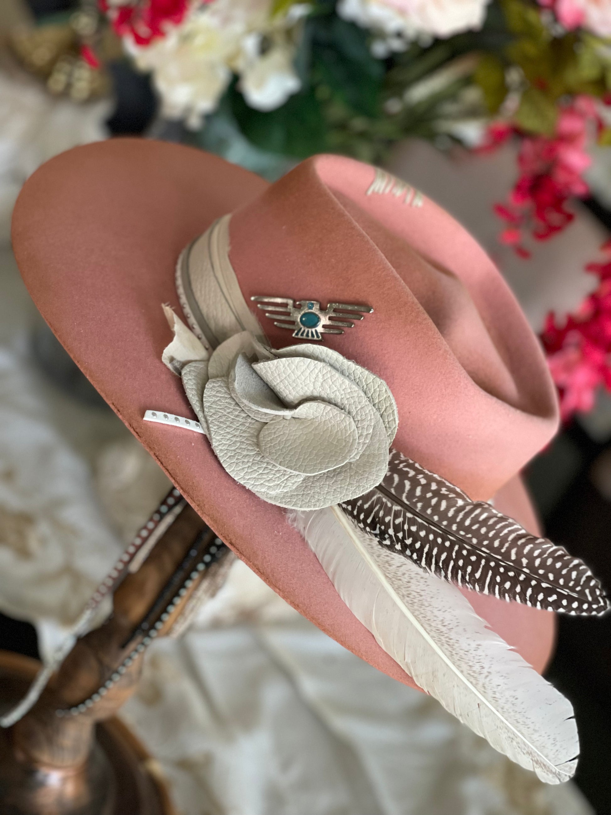 Gorgeous customized western fashion hat. Distressed pink felt hat with white and slate gray hatbands, accent stitching, thunderbird charm, leather flower clip, and distressed look.