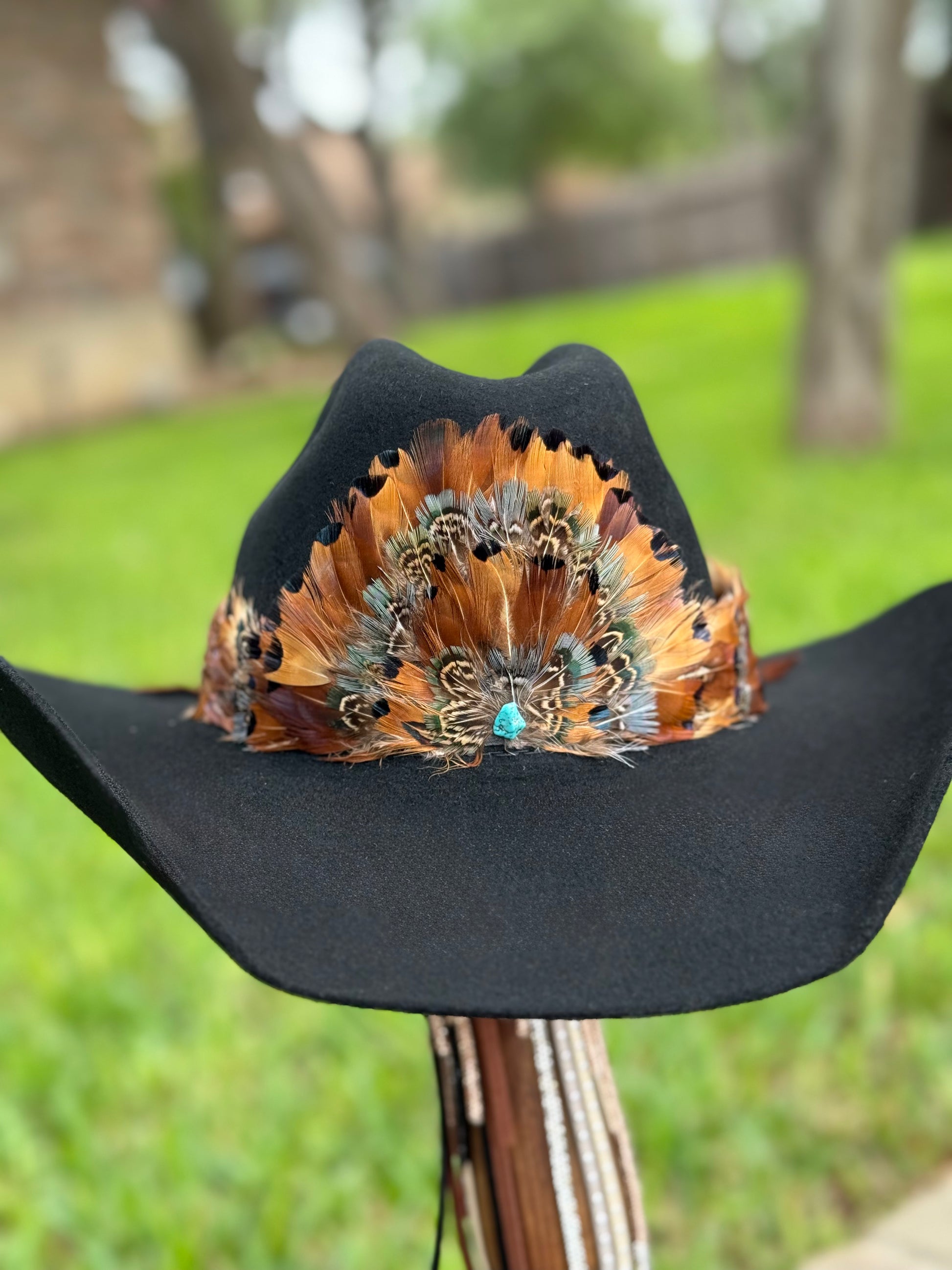 This beautiful pheasant feather hatband gives retro vibes. Accented with a front feather fan and turquoise stone. Hand-made feather hatband is adjustable and will fit any hat. Easy to take off or move between hats.