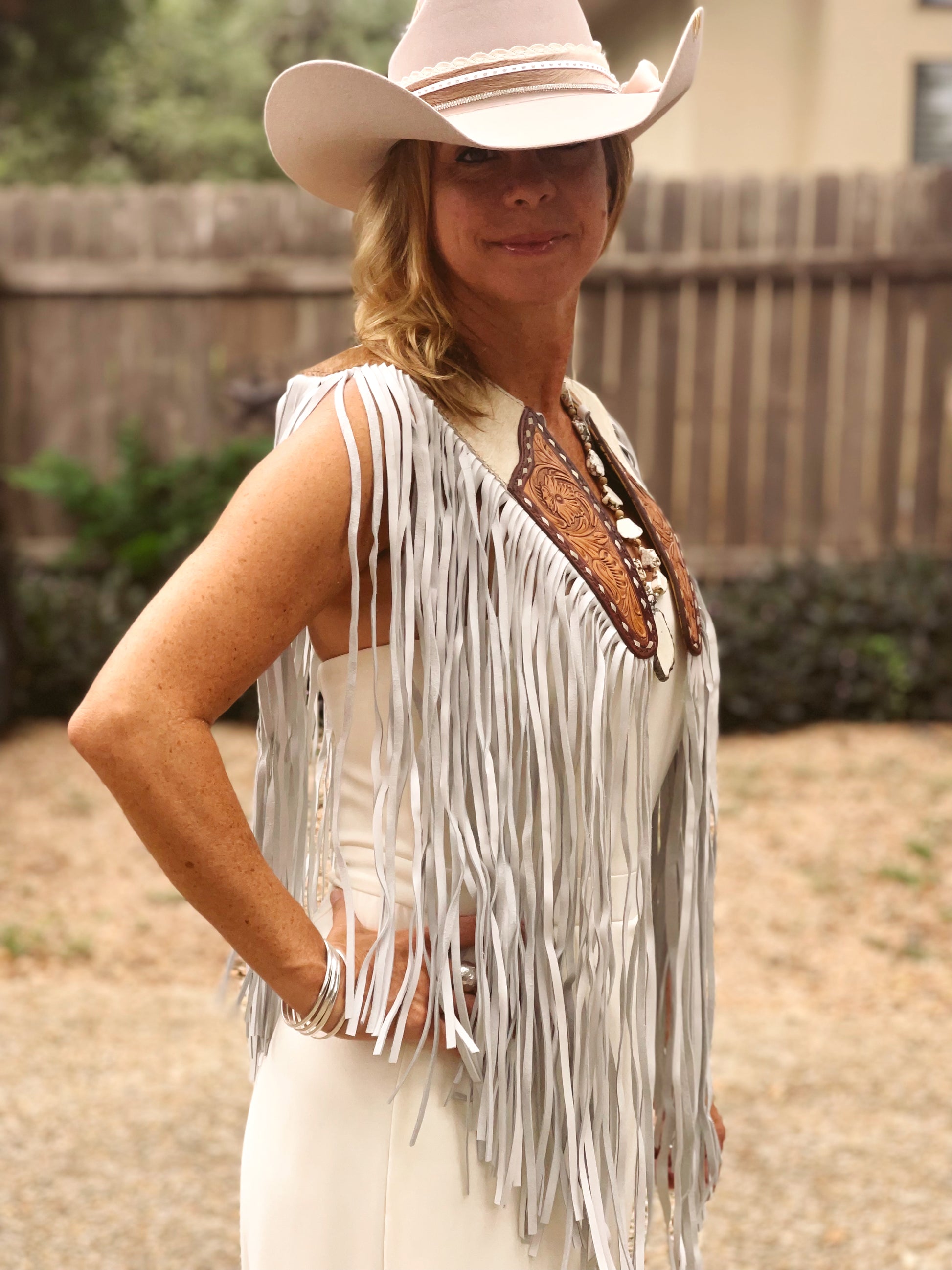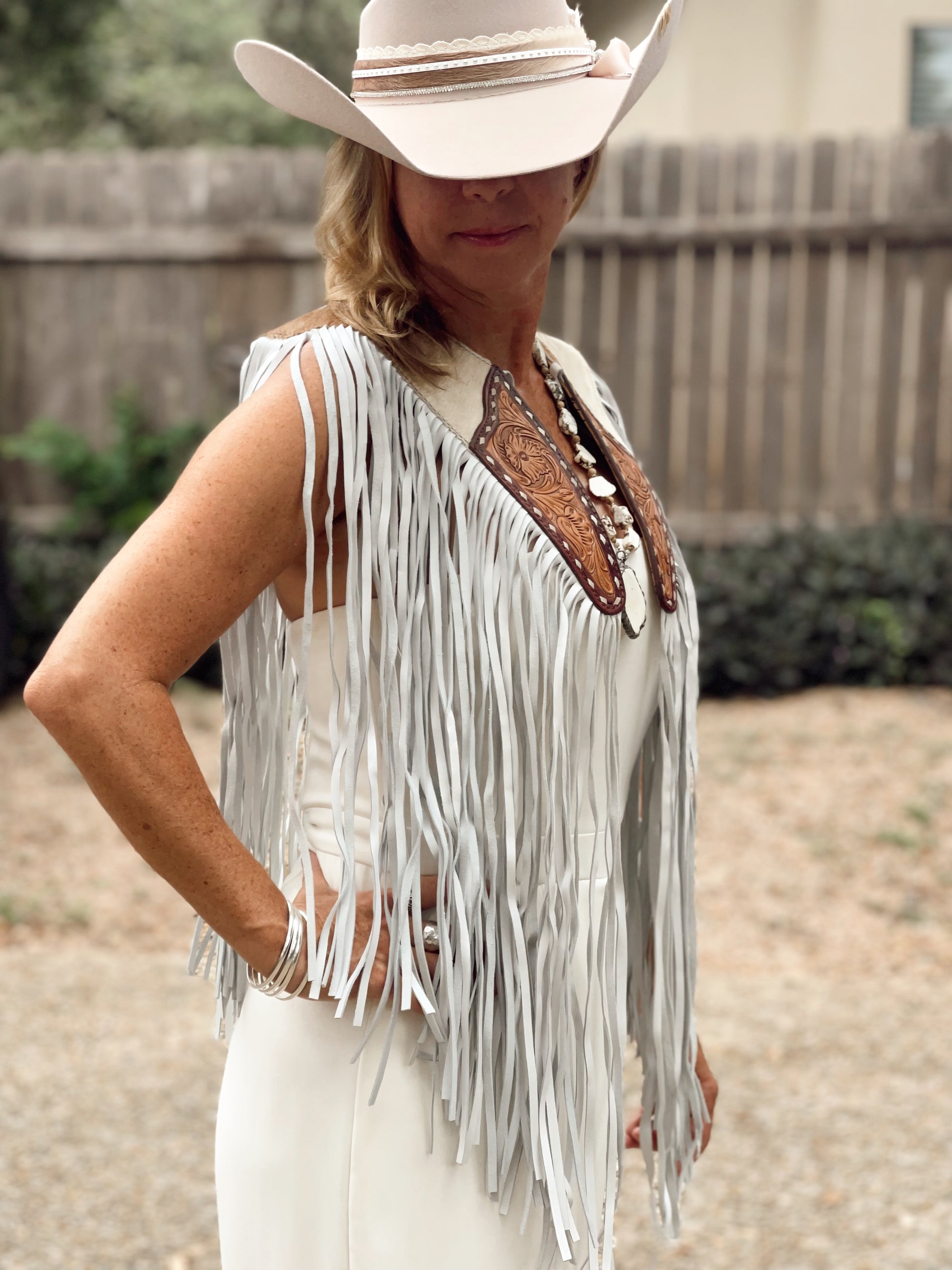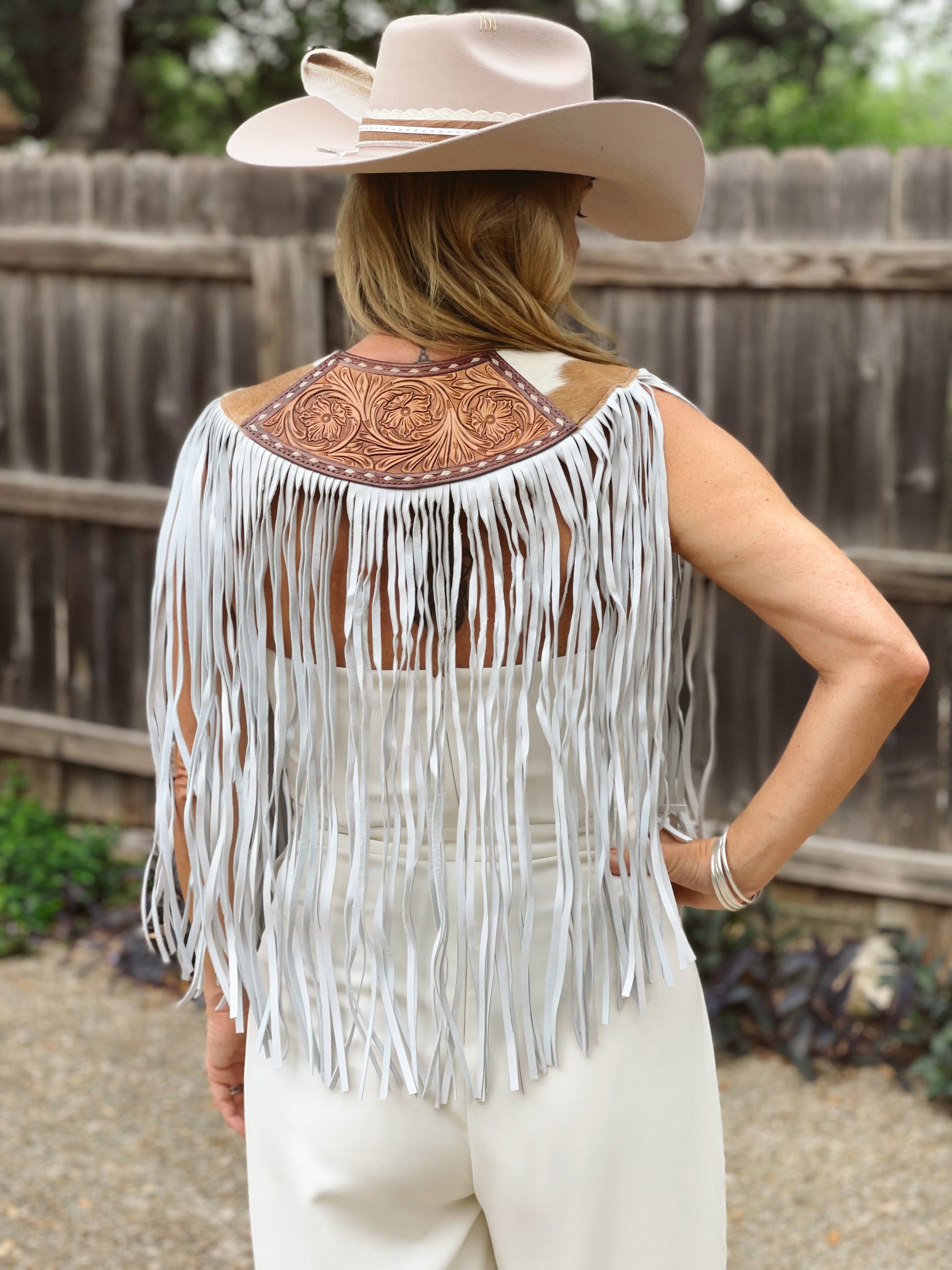 Absolutely amazing statement piece for any outfit. Genuine leather fringe cape drapes over any outfit. Add it to a strapless dress, over a blazer, over your favorite shirt...the possibilities are endless. Accented with tooled leather and genuine cowhide.