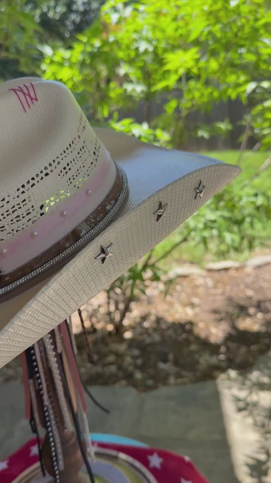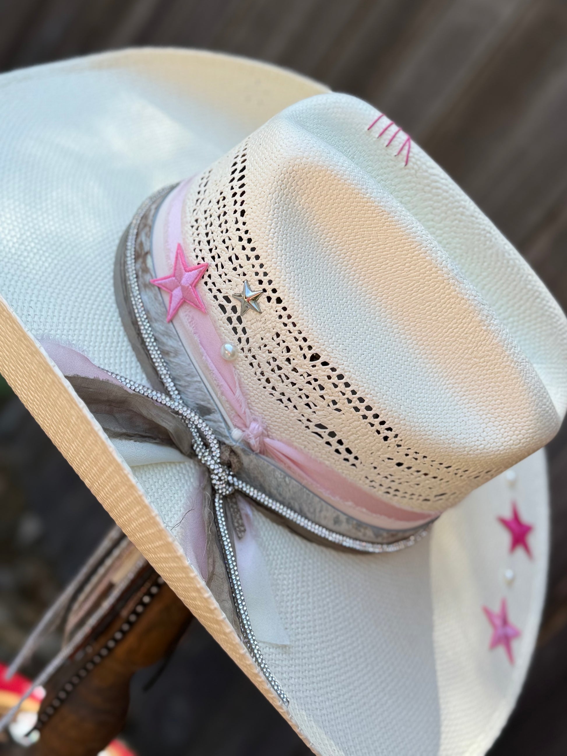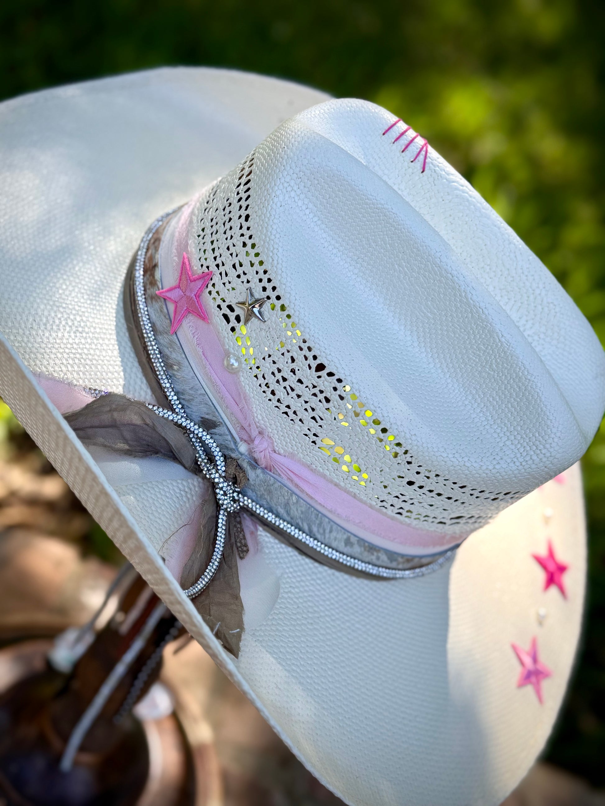 Get ready for all your summer festivities with this customized straw cowboy hat. Perfect for summer concerts, the beach, river, lake or having some cold drinks with friends. Loads of fun colors, embellishments, hand stitching and STARS!