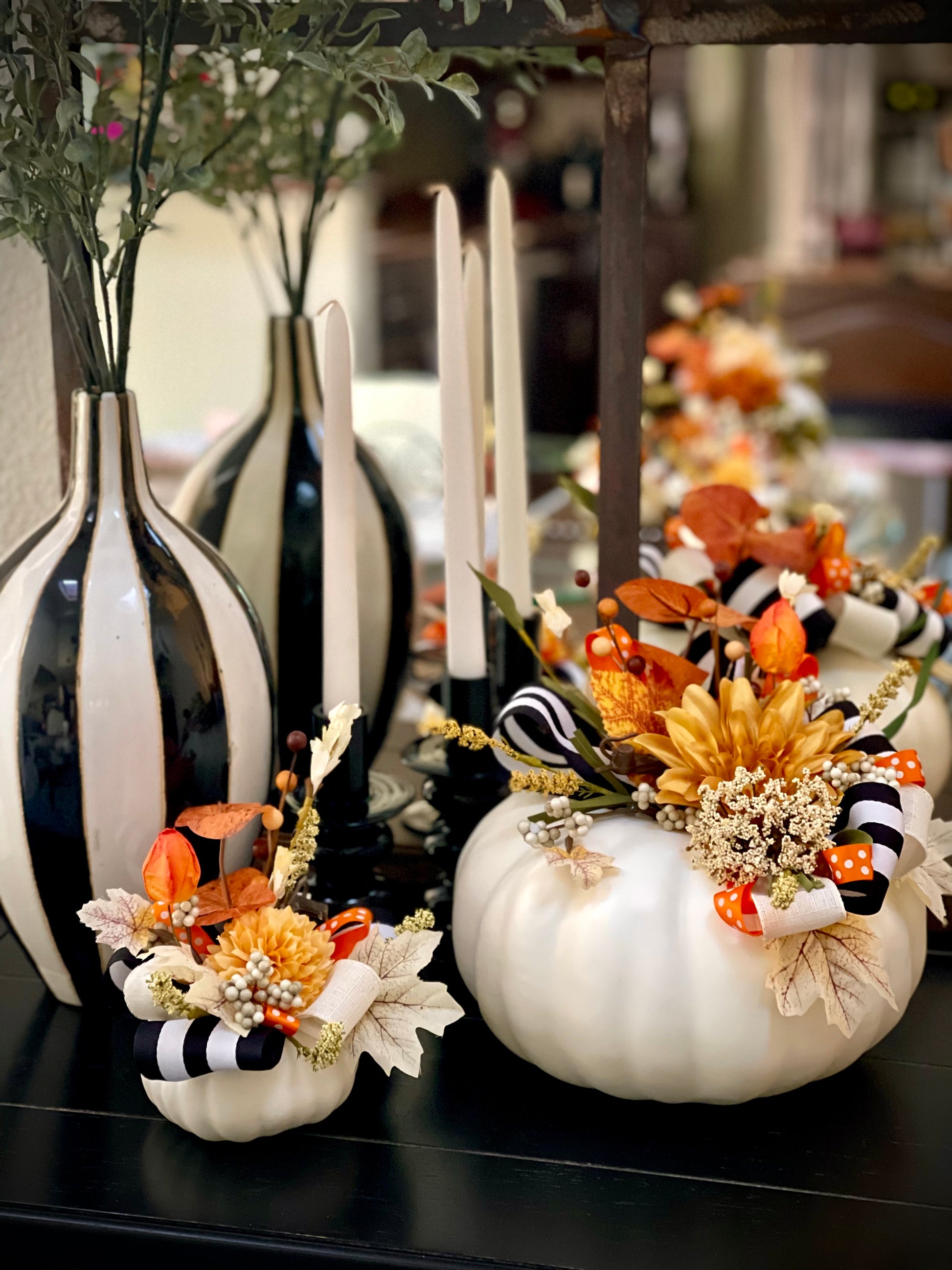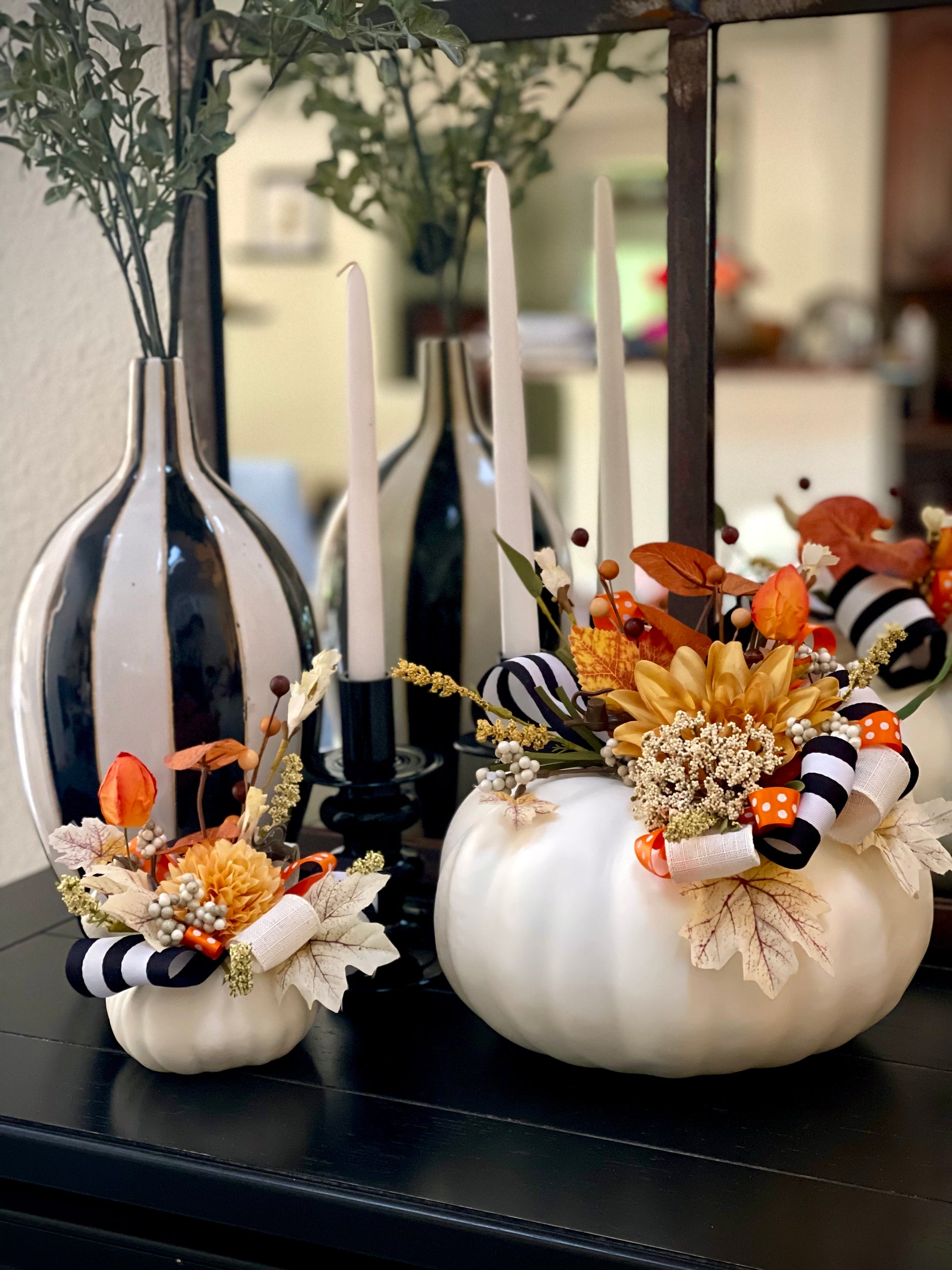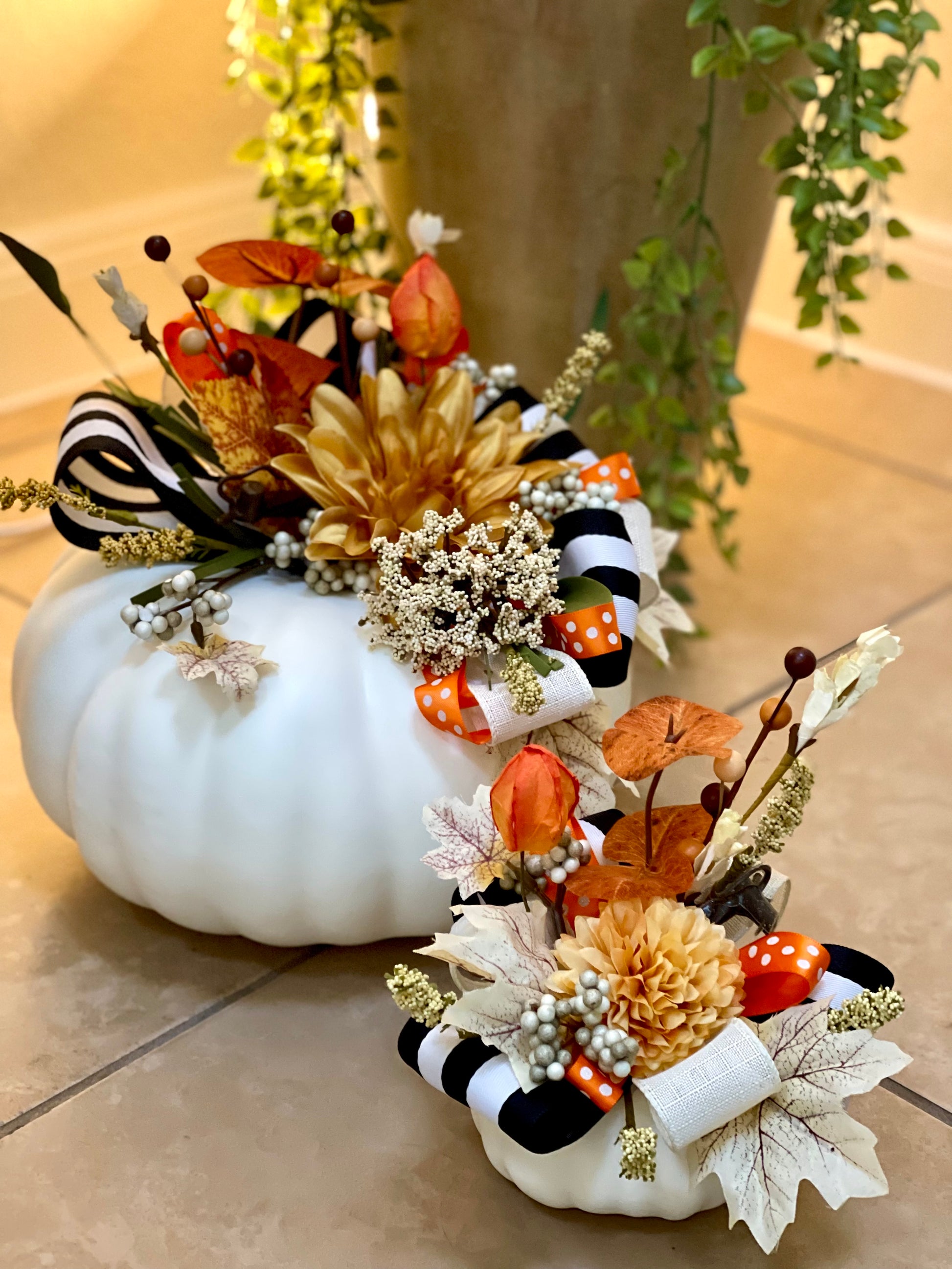 Hello there pumpkin! Accentuate your holiday table decor or mantle with these elegant handmade decorative faux pumpkins. Ribbons cascade down the side of the large pumpkin and is adorned with beautiful silk flowers. The small pumpkins have a beautiful bouquet of ribbons and flowers around the top.