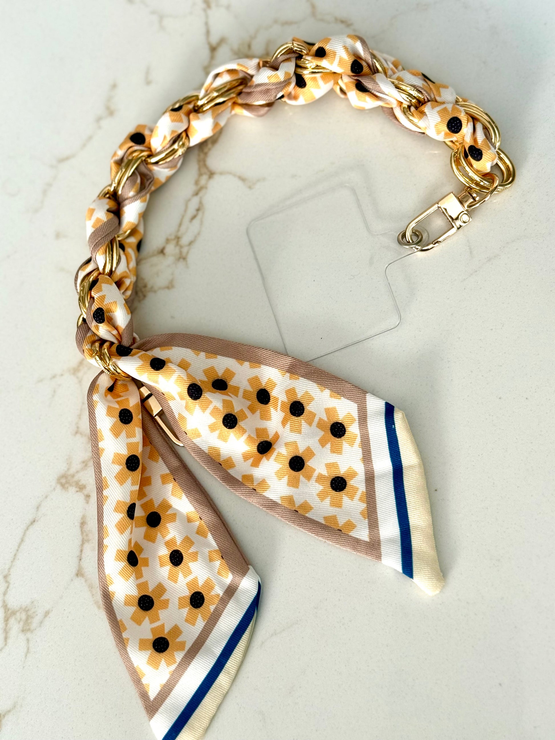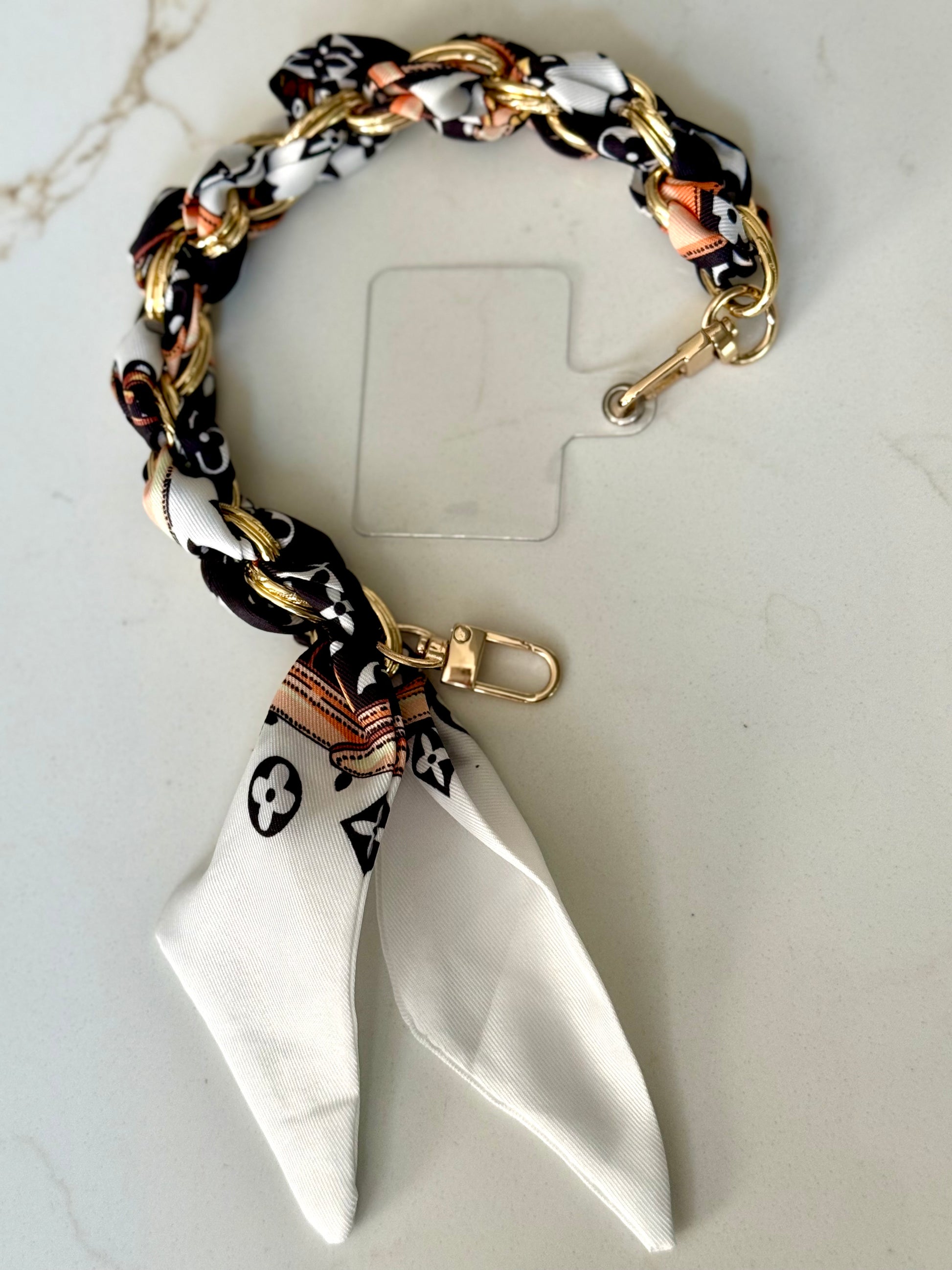 This gorgeous chain is interlaced with a beautiful satin scarf that gives this accessory an elegant and classy look. The transparent cell phone attachment goes inside of your phone case and the chain clips onto the tab that extends out the charging slot. The chain and scarf can easily attach/detach to create different looks between your purse and your phone.