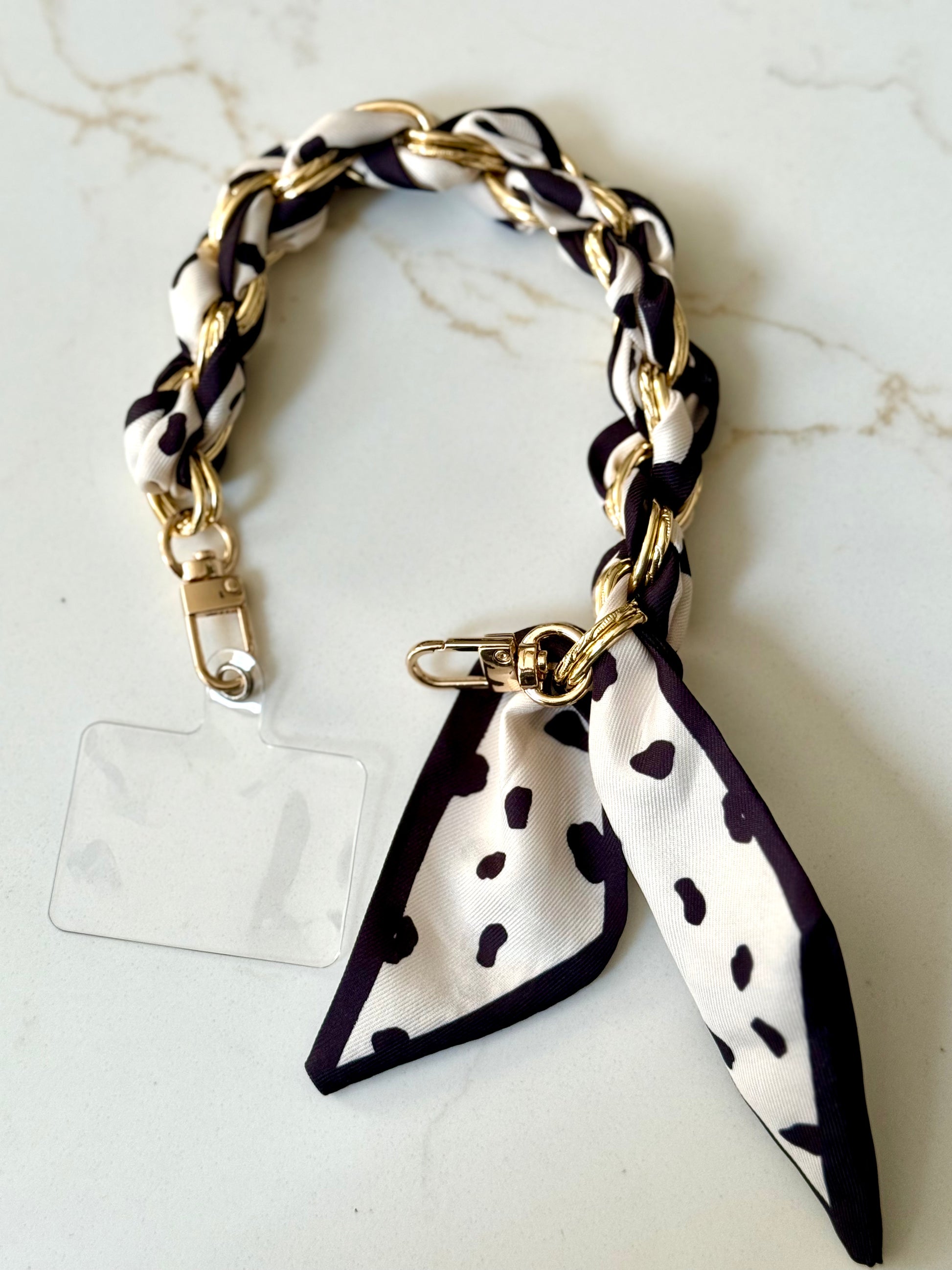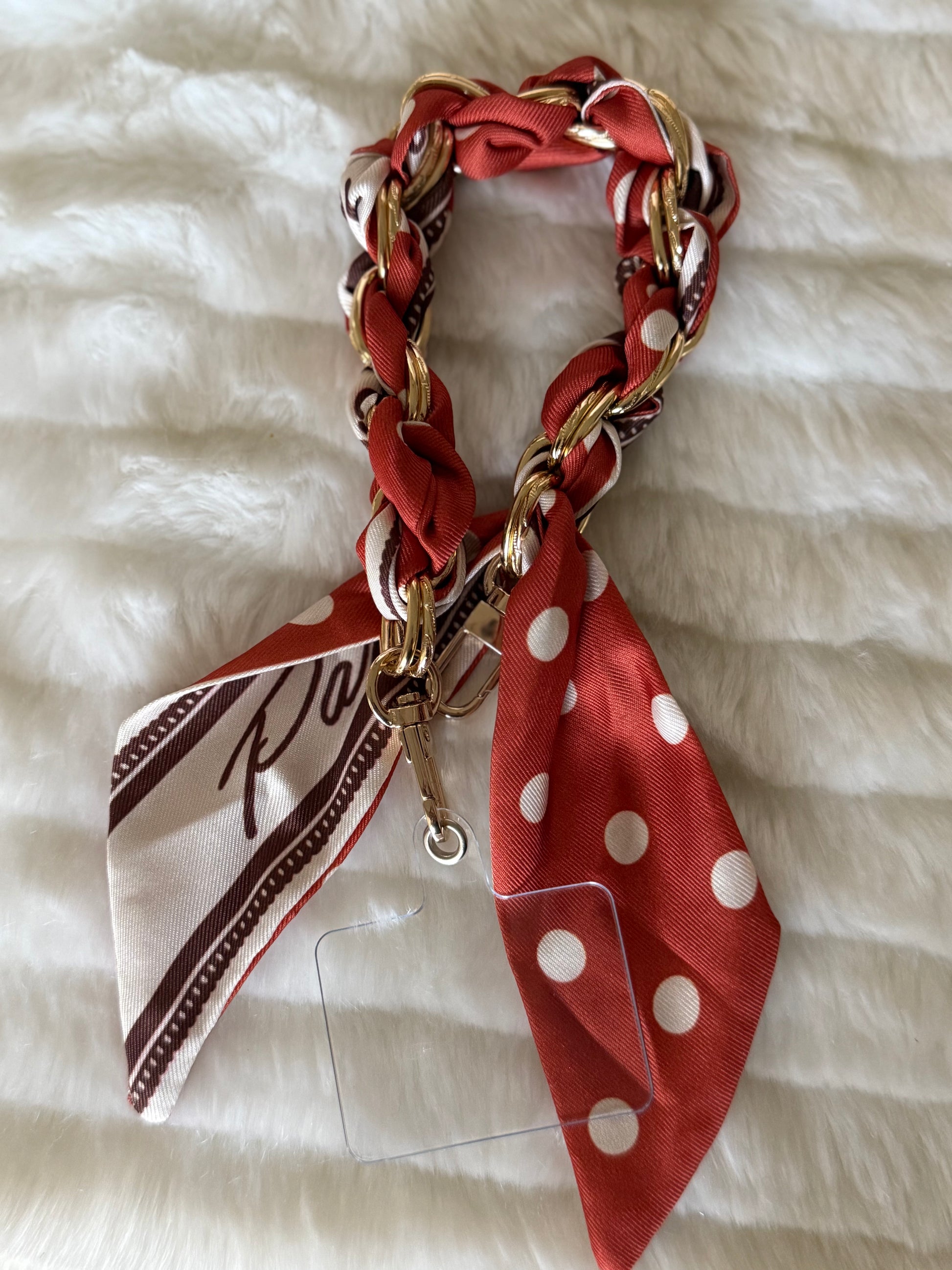 This gorgeous chain is interlaced with a beautiful satin scarf that gives this accessory an elegant and classy look. The transparent cell phone attachment goes inside of your phone case and the chain clips onto the tab that extends out the charging slot. The chain and scarf can easily attach/detach to create different looks between your purse and your phone.