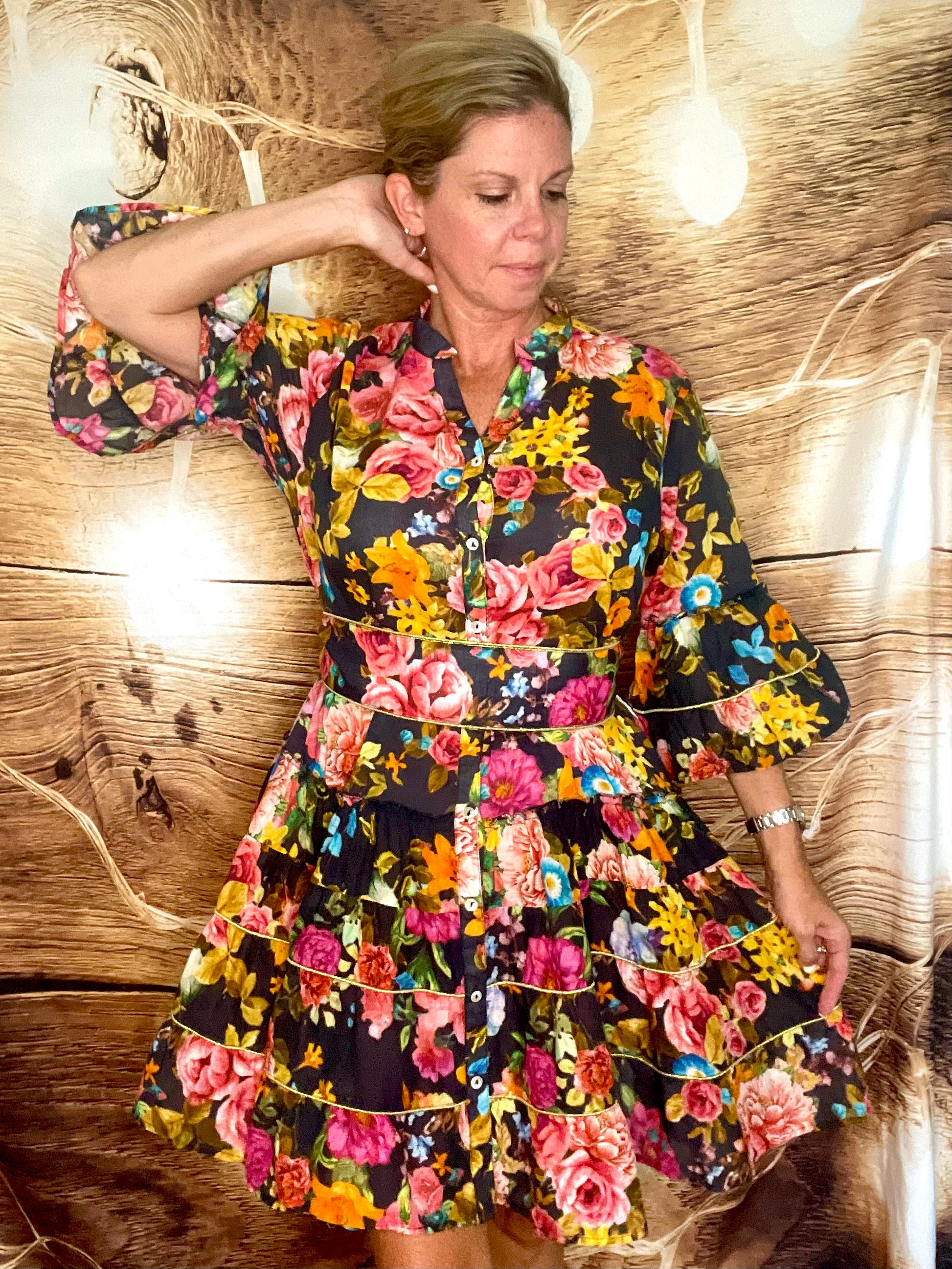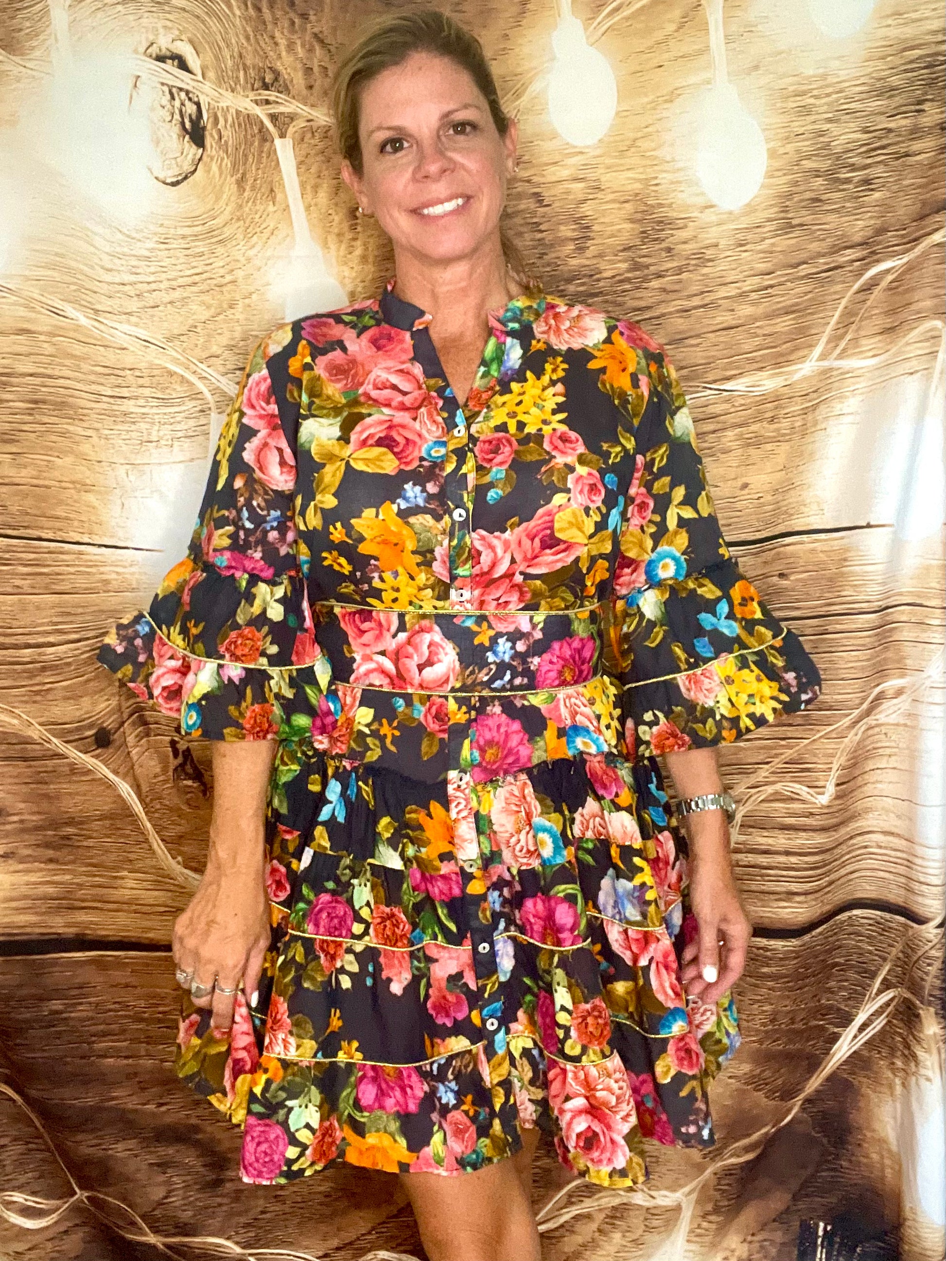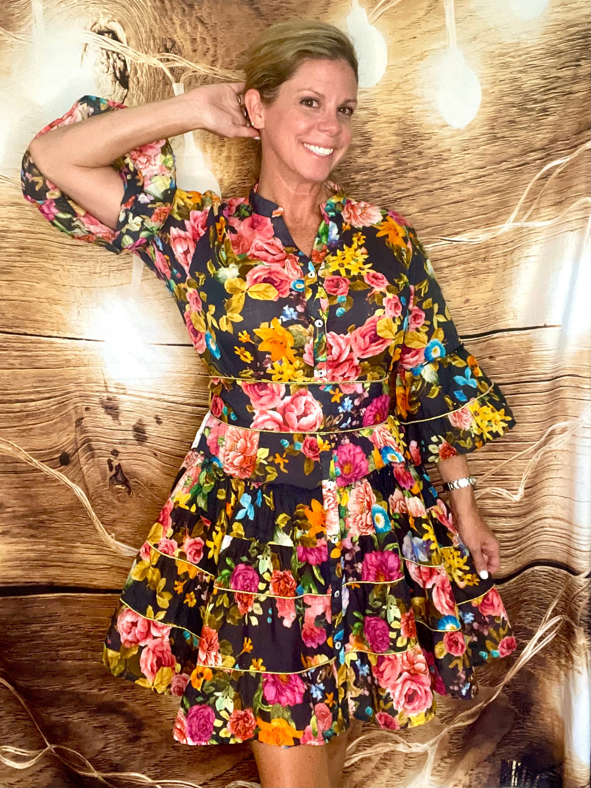 Light and flowing, floral print dress with plenty of ruffles and a color-match belt. The belt cinches the dress at the waist to create a beautiful hour-glass figure. Absolutely stunning and unique.