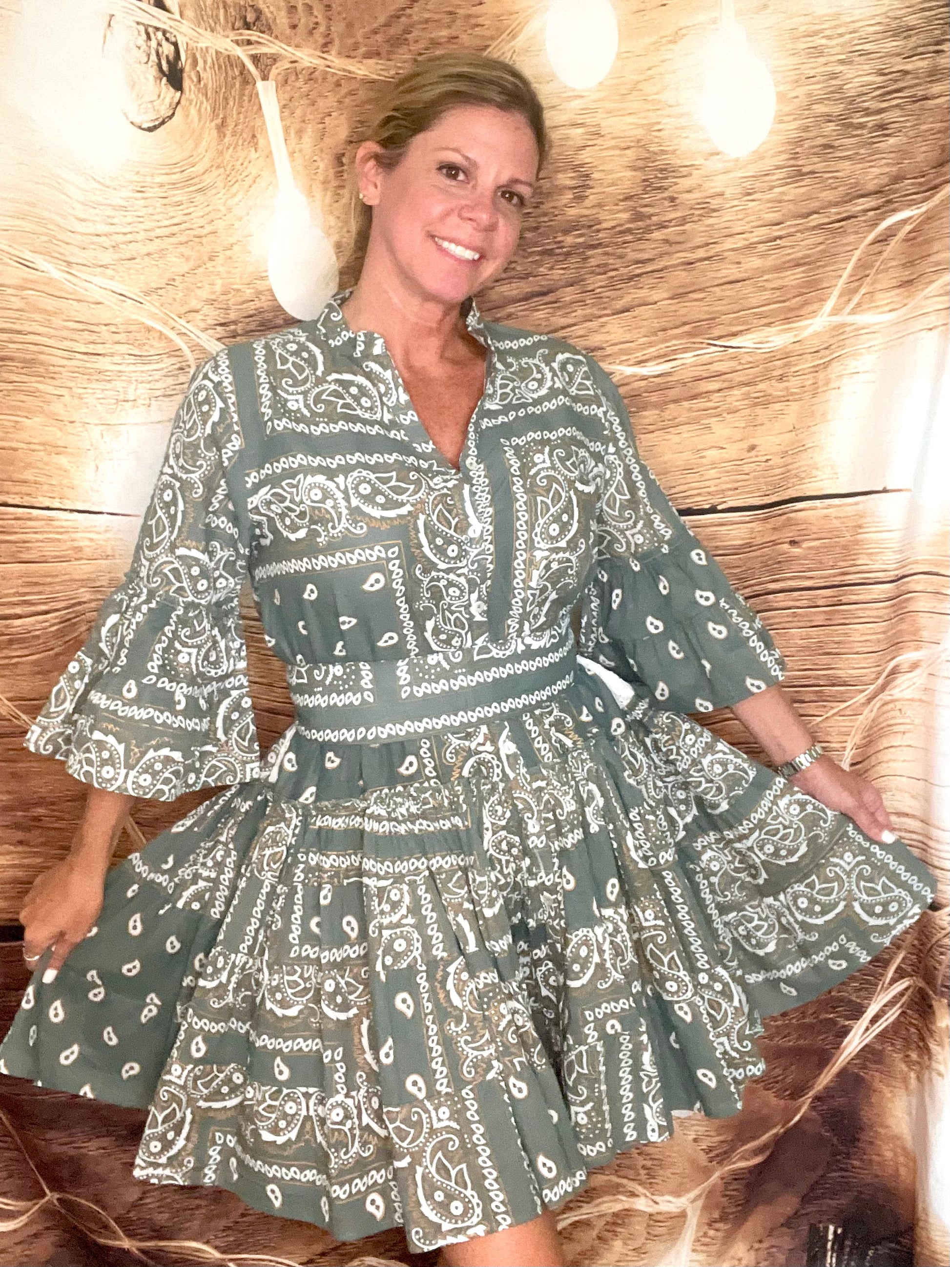 Light and flowing, bandana print dress with plenty of ruffles and a color-match belt. The belt cinches the dress at the waist to create a beautiful hour-glass figure. Absolutely stunning and unique. (This dress is gray, not green as per the tint of the picture)