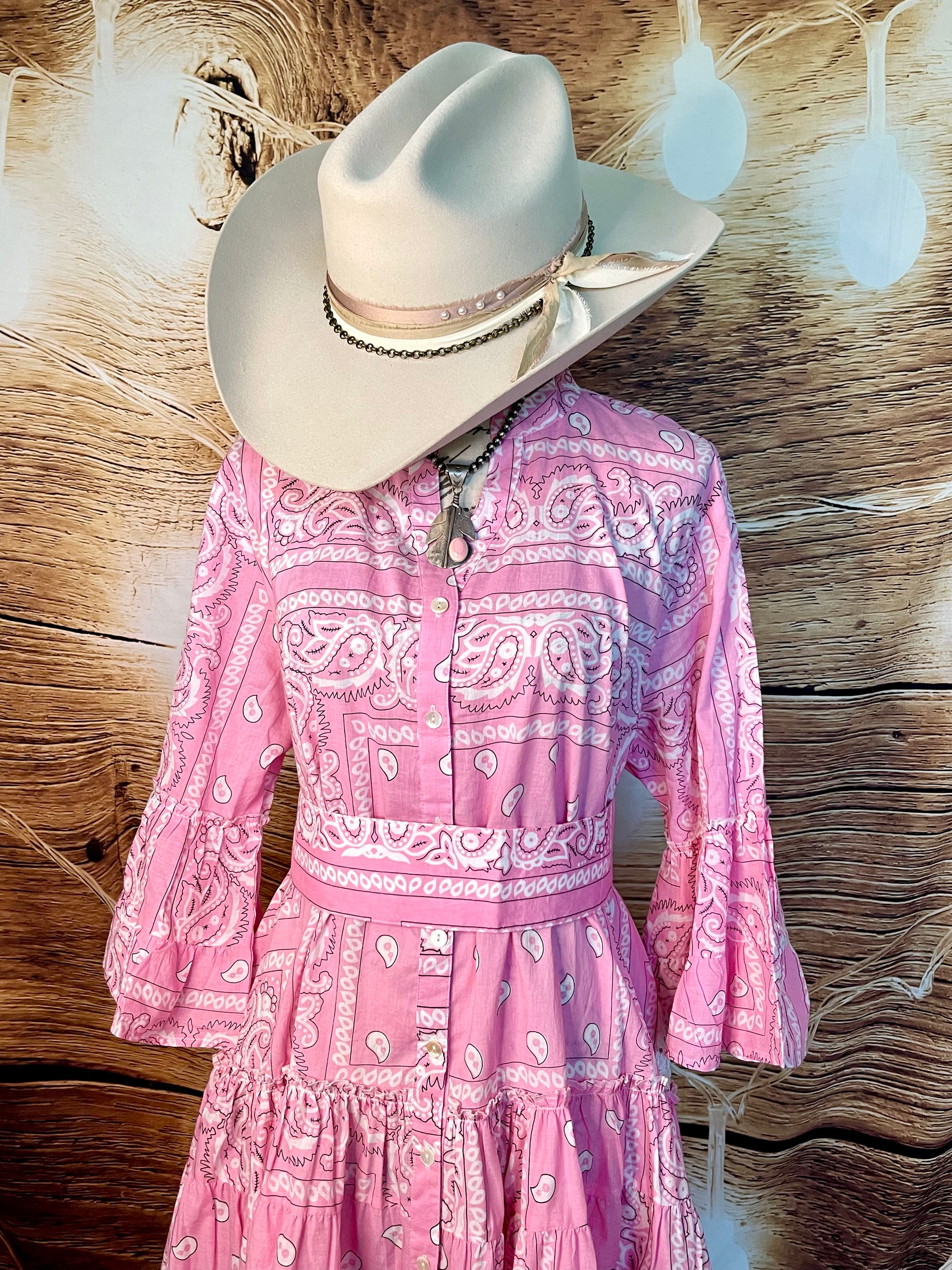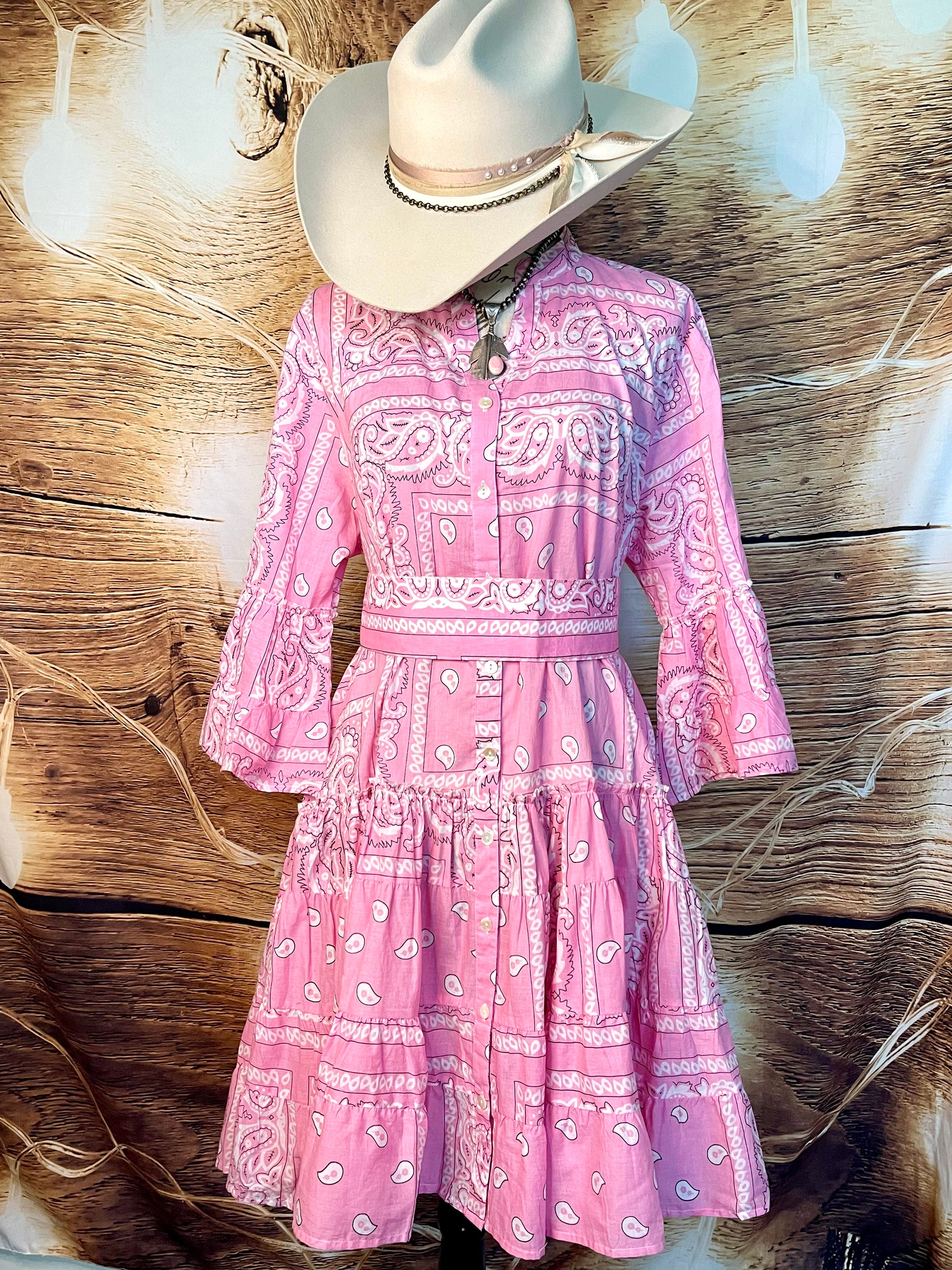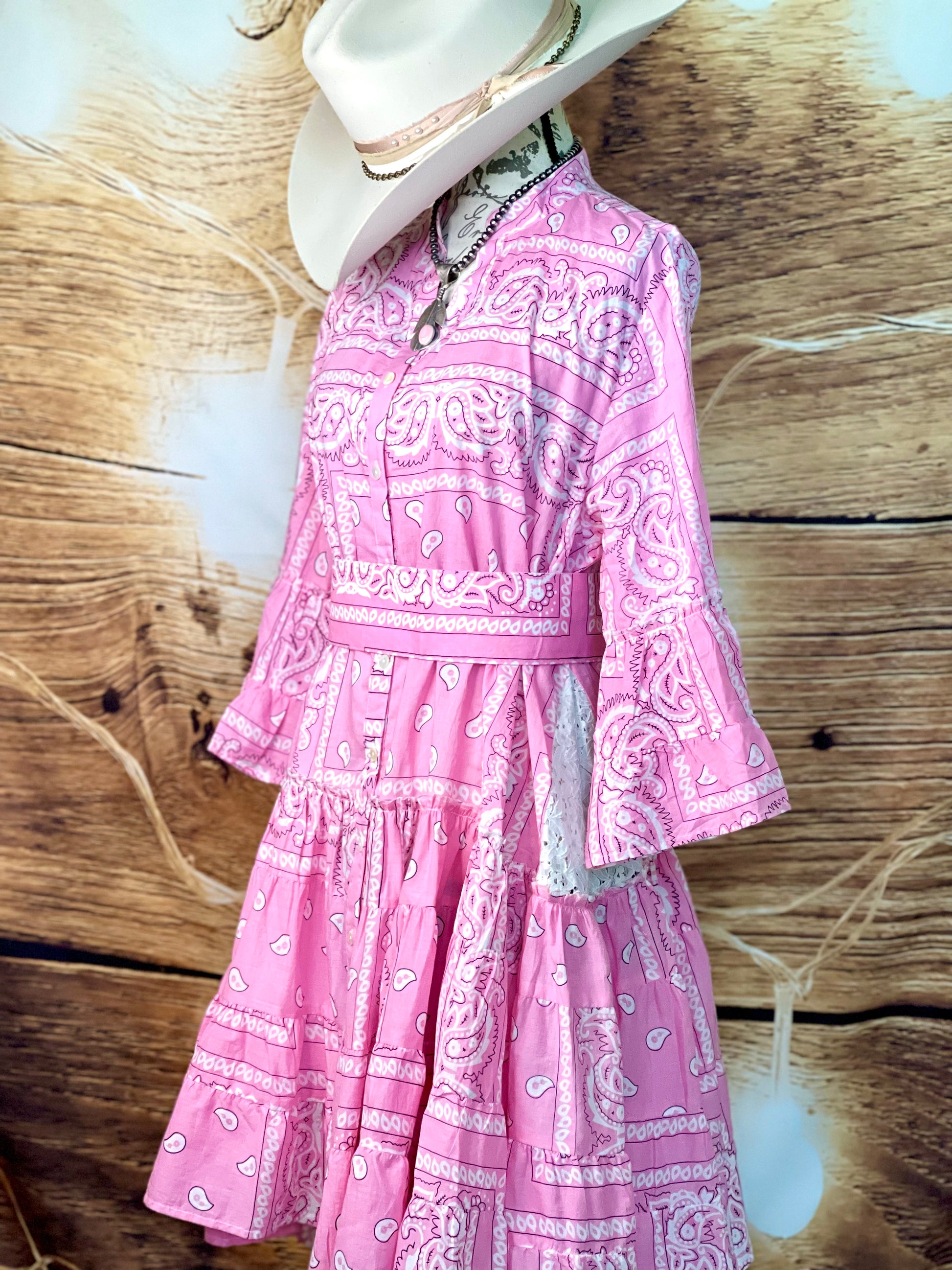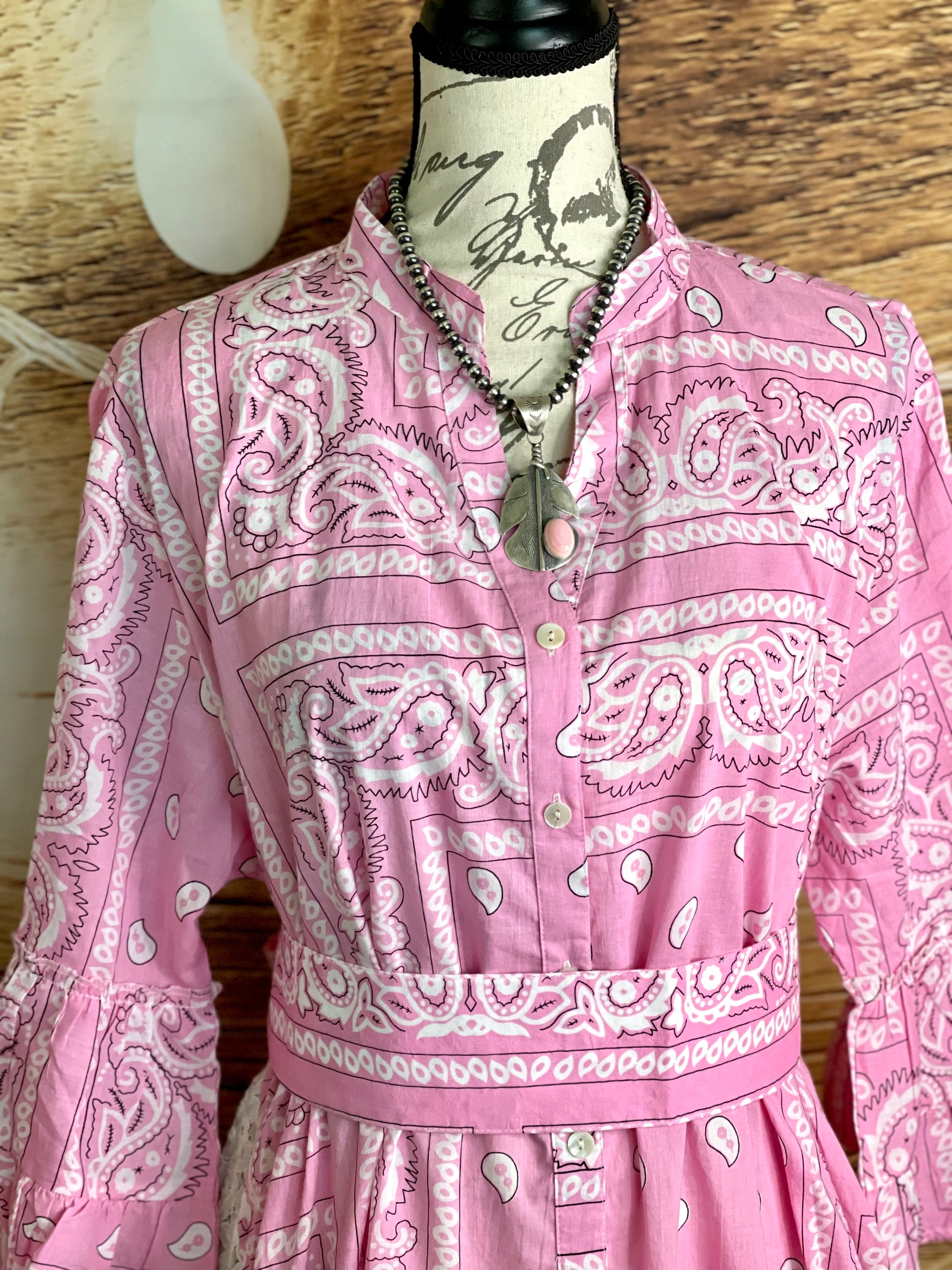 Light and flowing, bandana print dress with plenty of ruffles and a color-match belt. The belt cinches the dress at the waist to create a beautiful hour-glass figure. Absolutely stunning and unique.