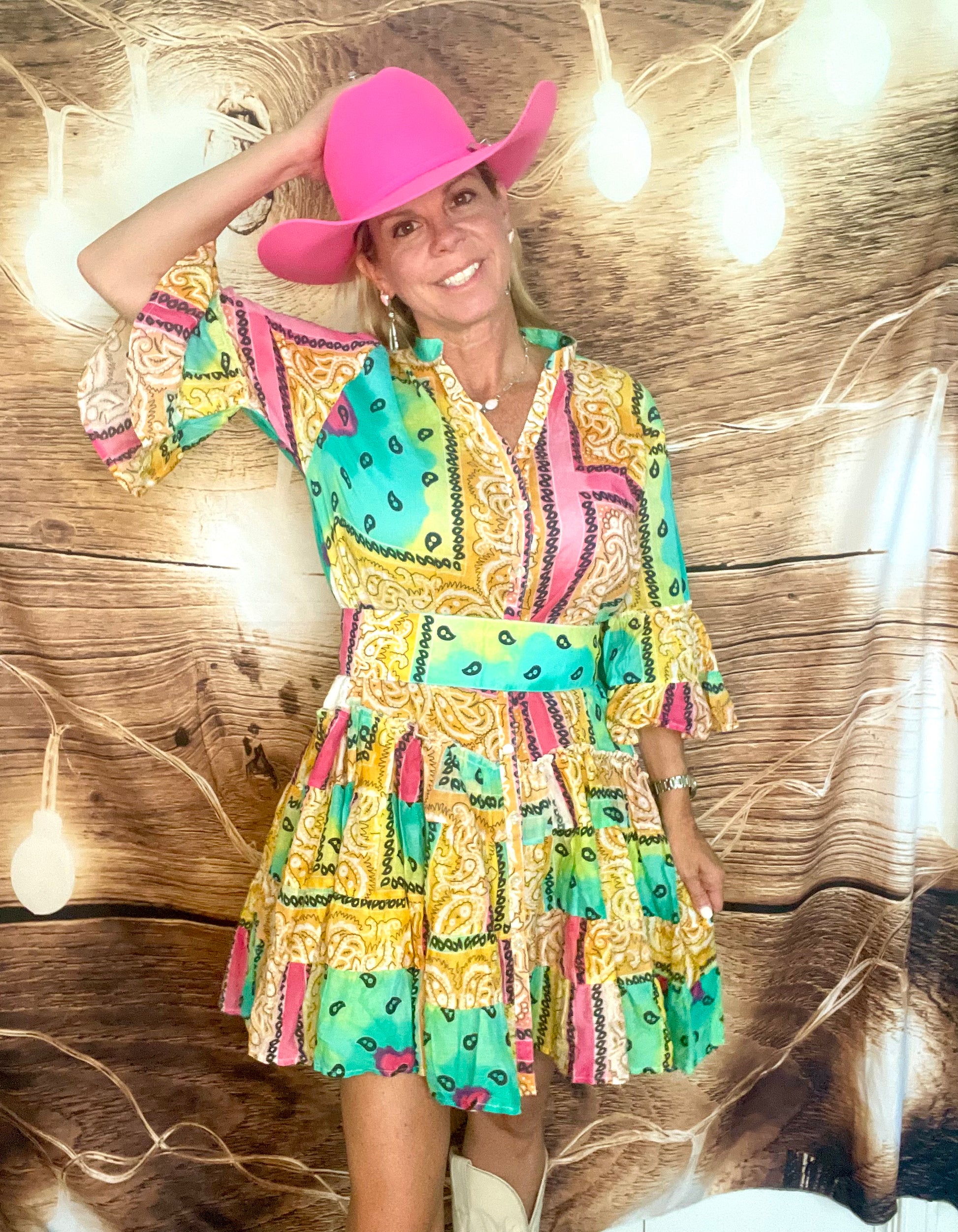 Light and flowing, bandana print dress with plenty of ruffles and a color-match belt. The belt cinches the dress at the waist to create a beautiful hour-glass figure. Absolutely stunning and unique.