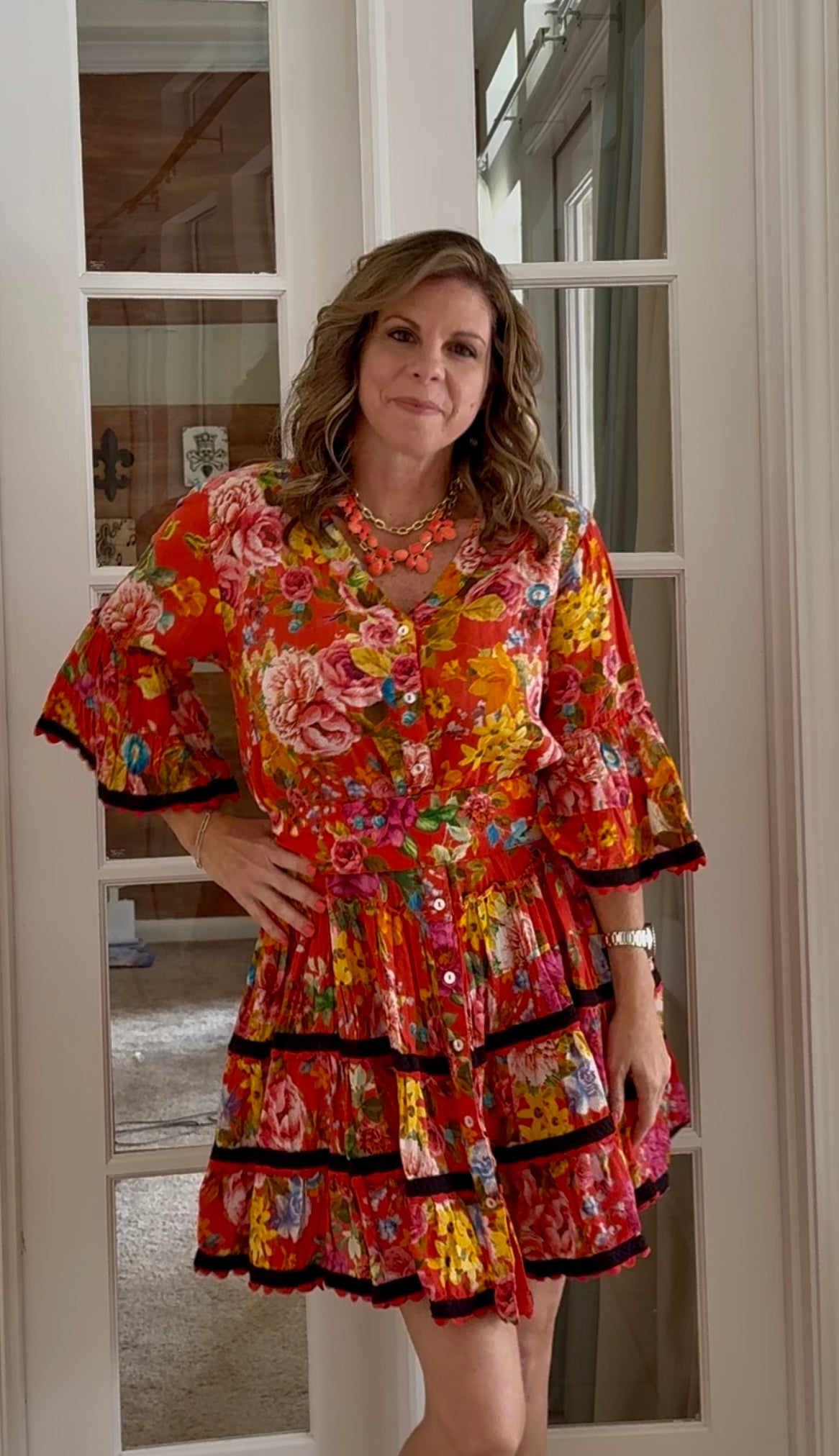 Light and flowing, floral print dress with plenty of ruffles and a color-match belt. The belt cinches the dress at the waist to create a beautiful hour-glass figure. Absolutely stunning and unique.
