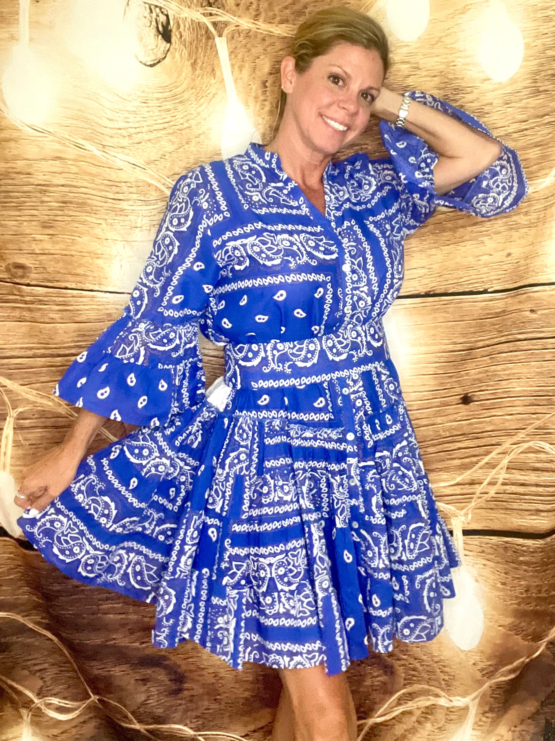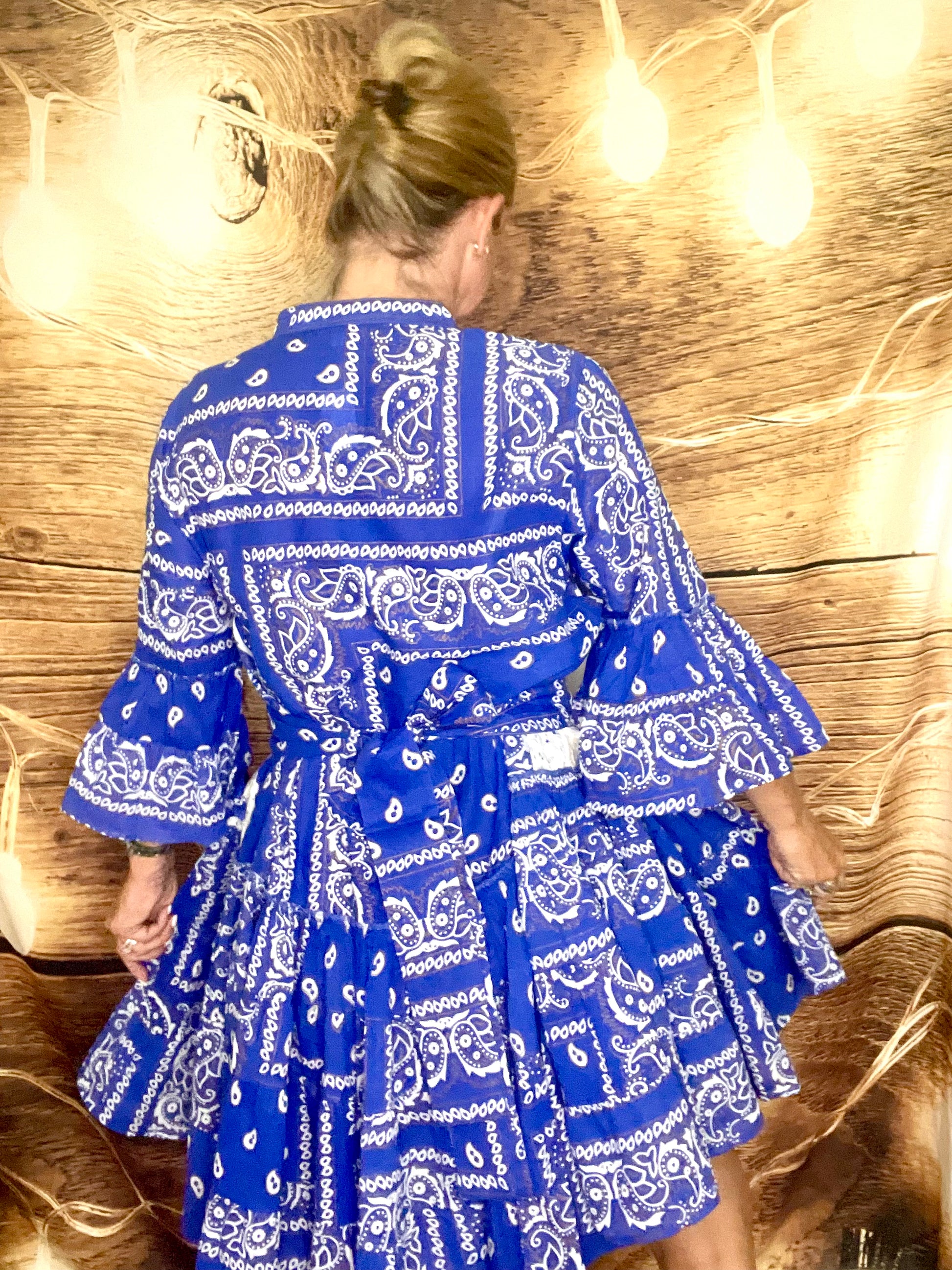 Light and flowing, bandana print dress with plenty of ruffles and a color-match belt. The belt cinches the dress at the waist to create a beautiful hour-glass figure. Absolutely stunning and unique.