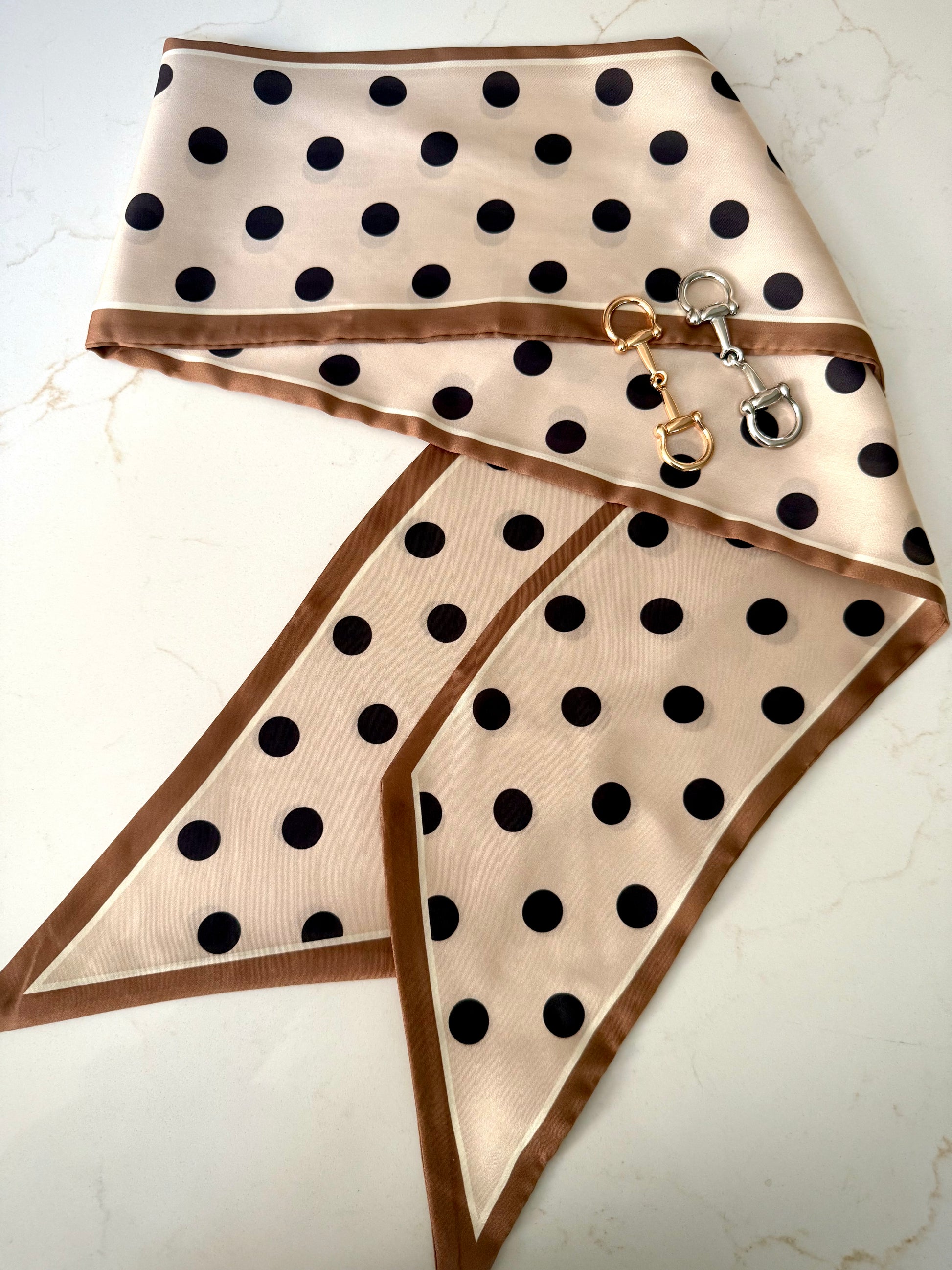 Silky and satin scarf with a classic pattern. It is sure to add a bright pop of color to any outfit or to wrap your purse strap.