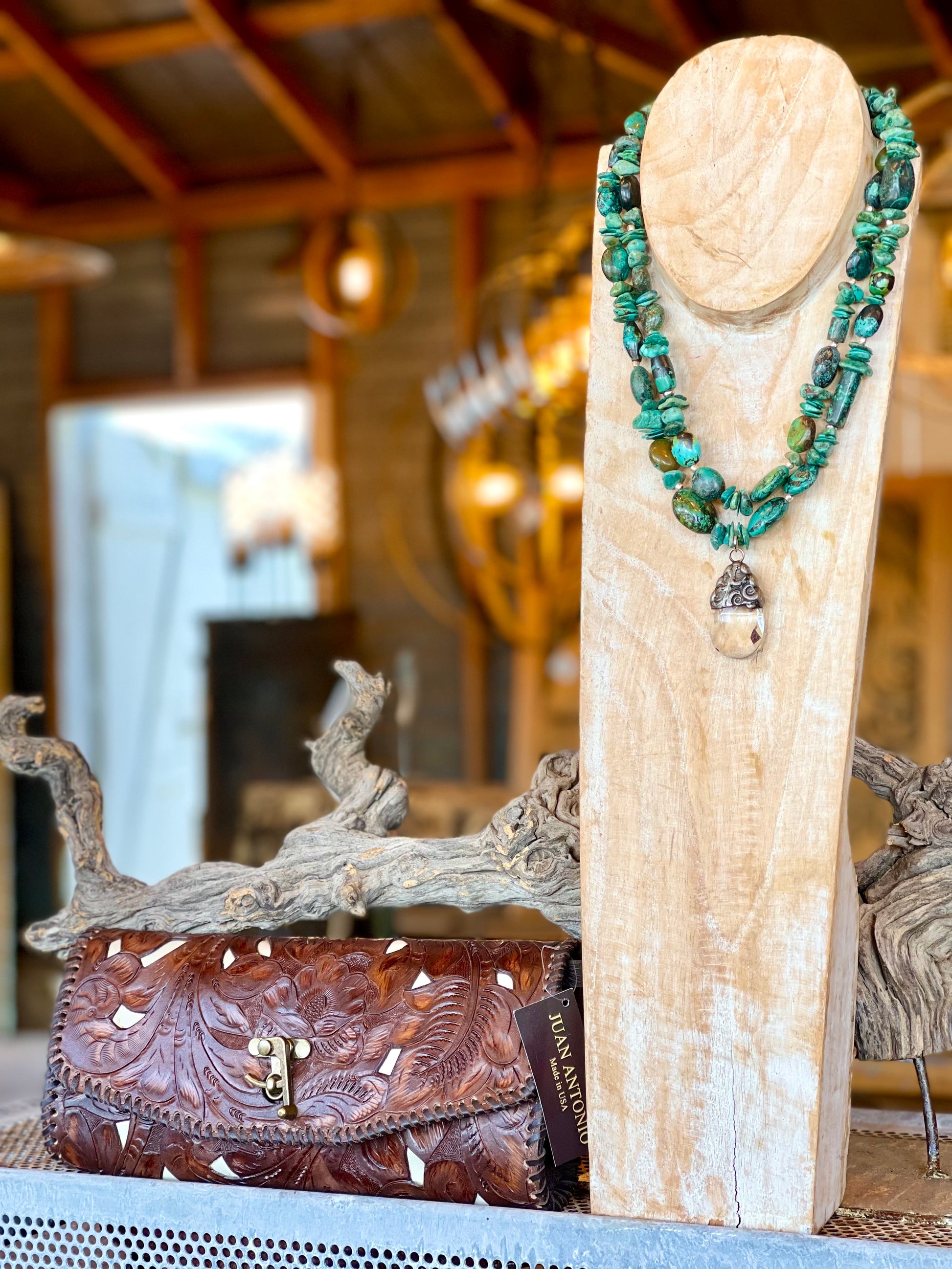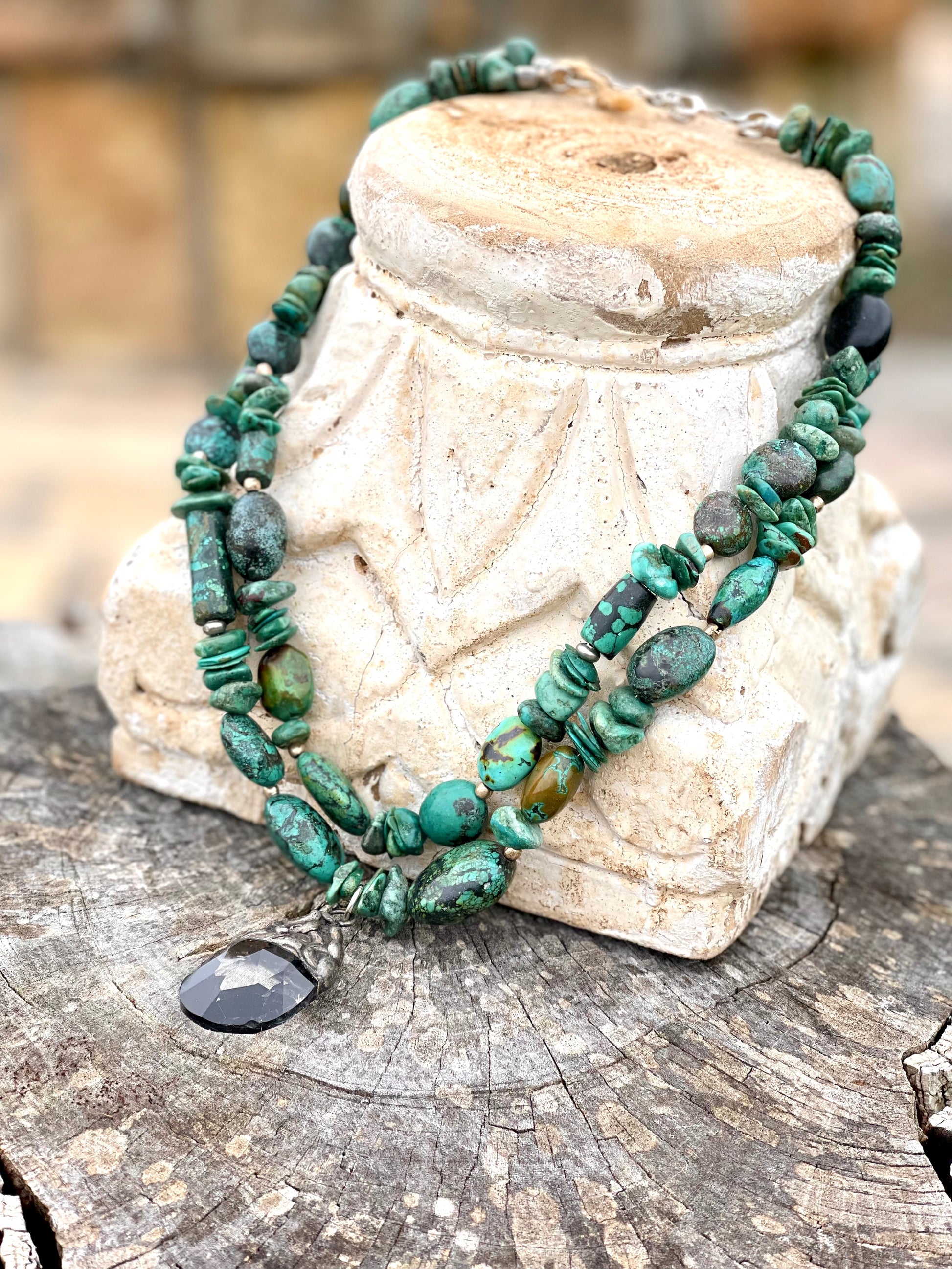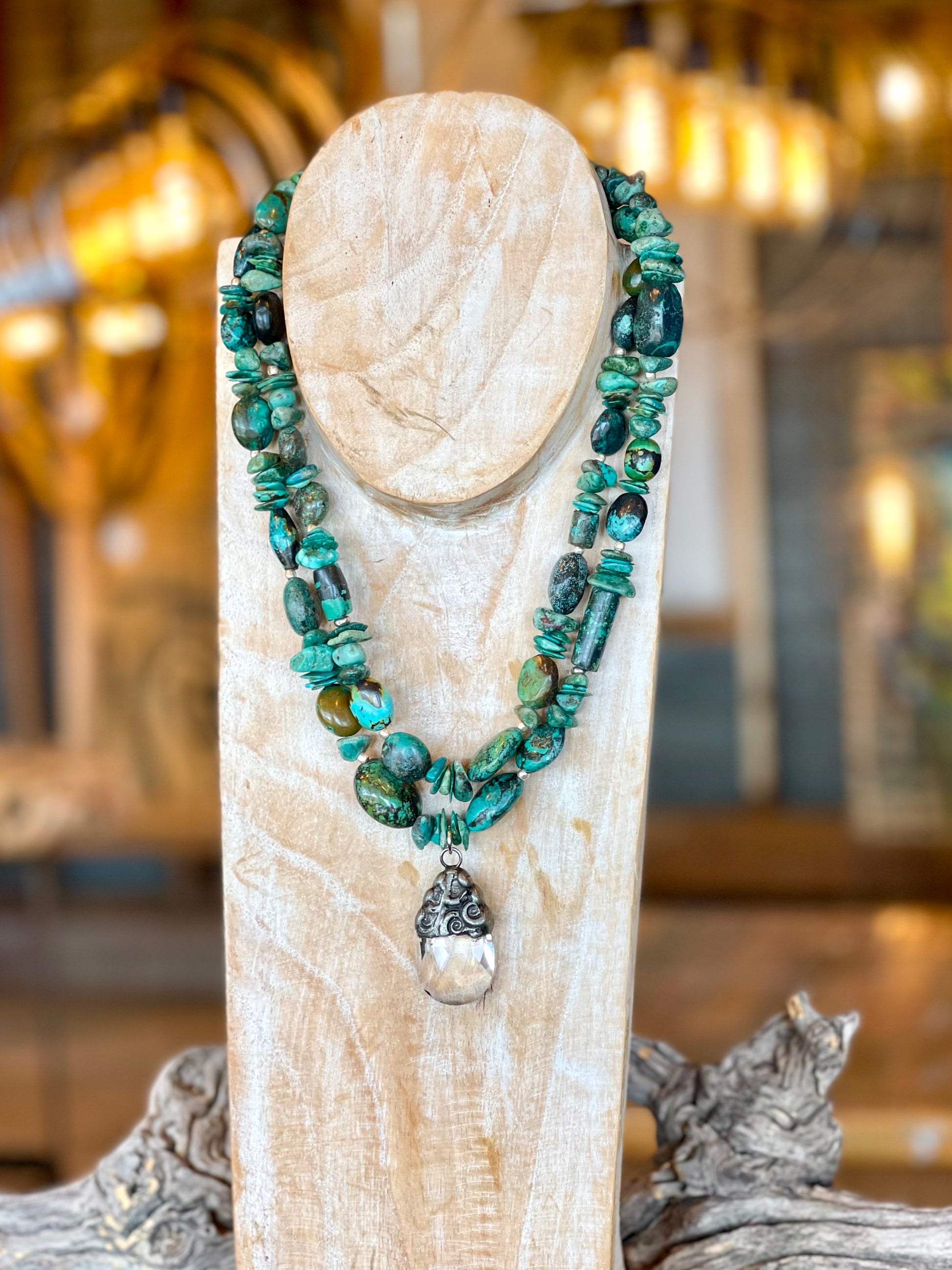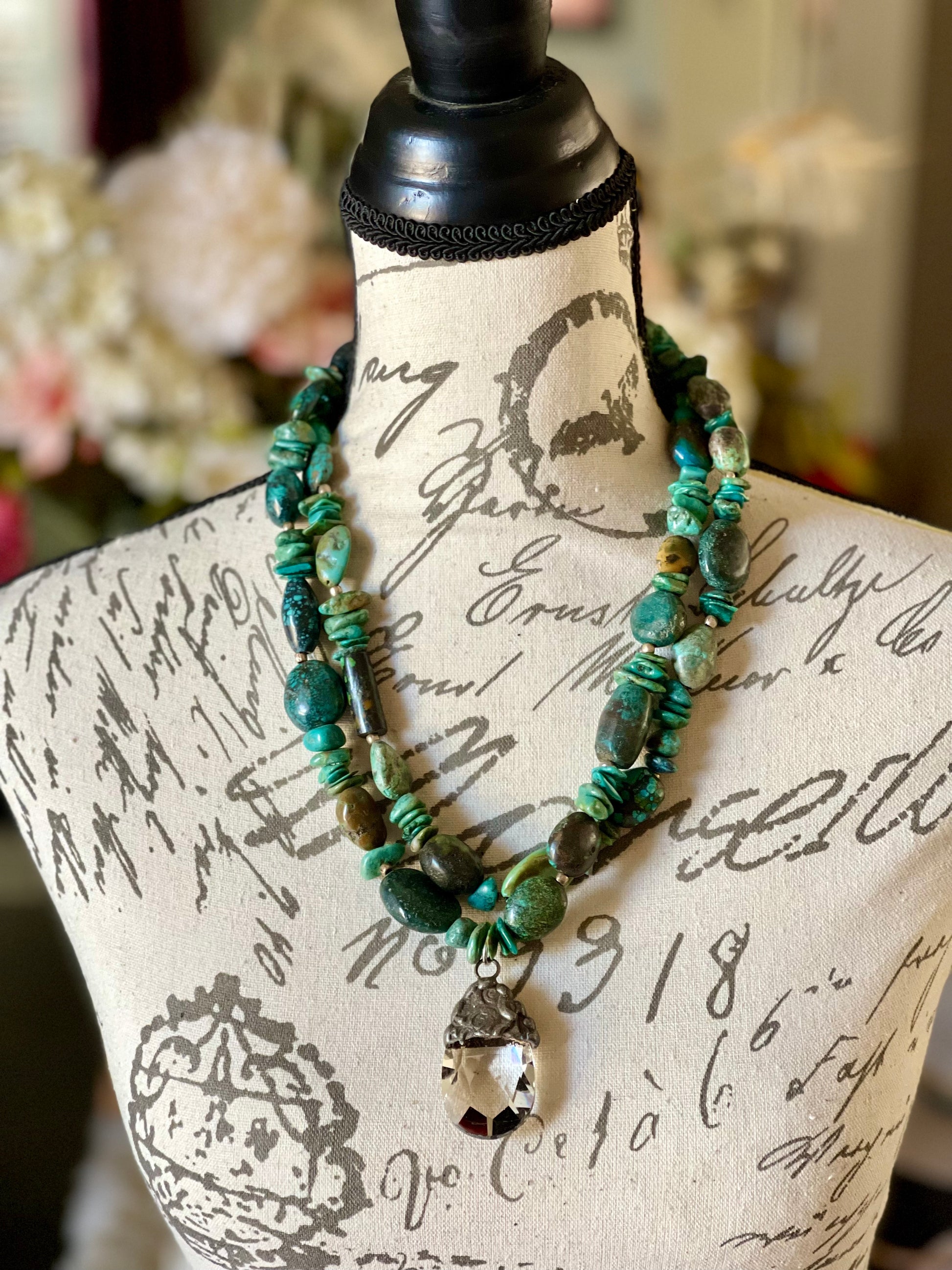 This is a double strand, jumbo green chunk turquoise necklace with brilliant crystal charm. It is a statement piece to say the least.