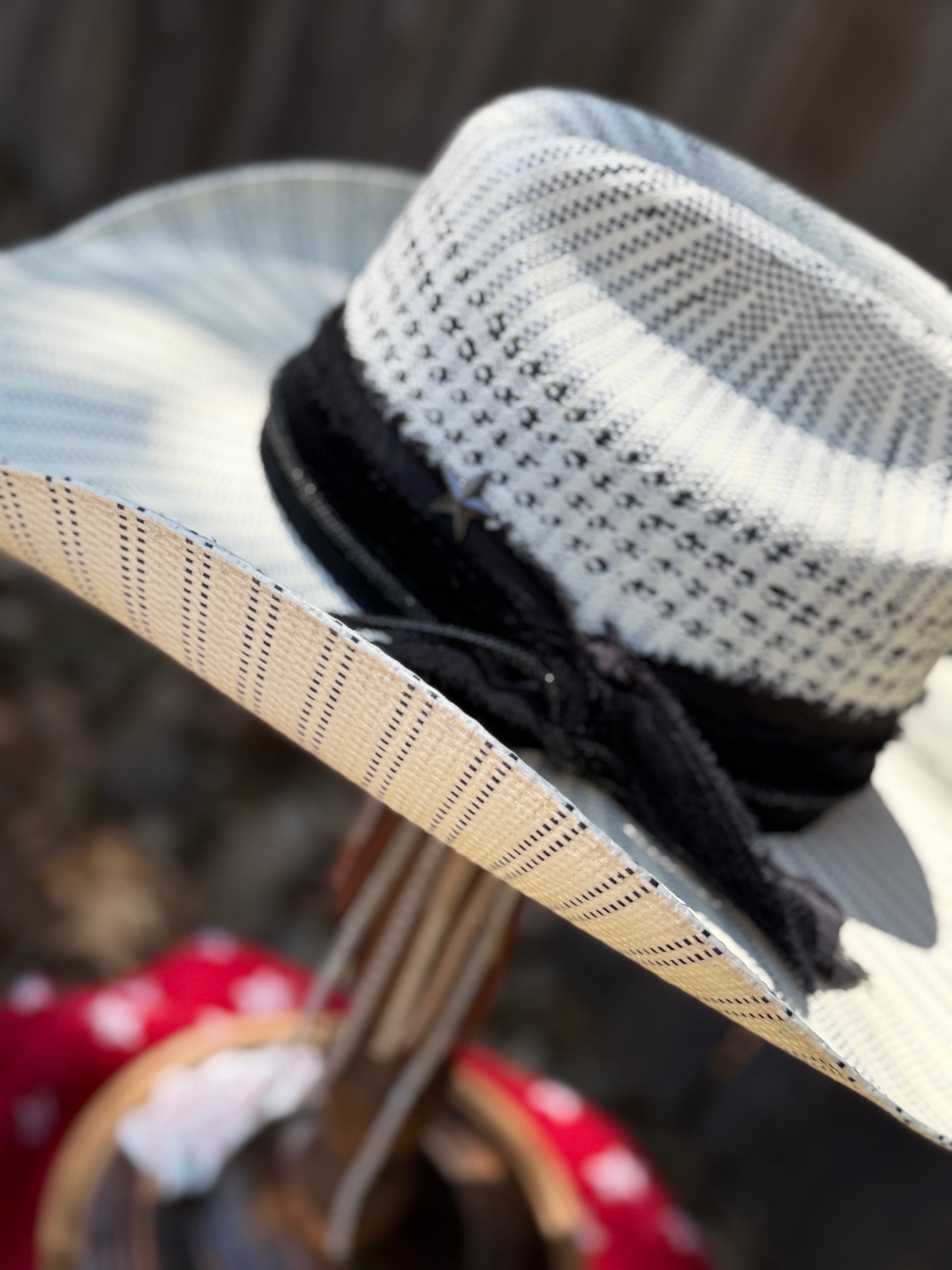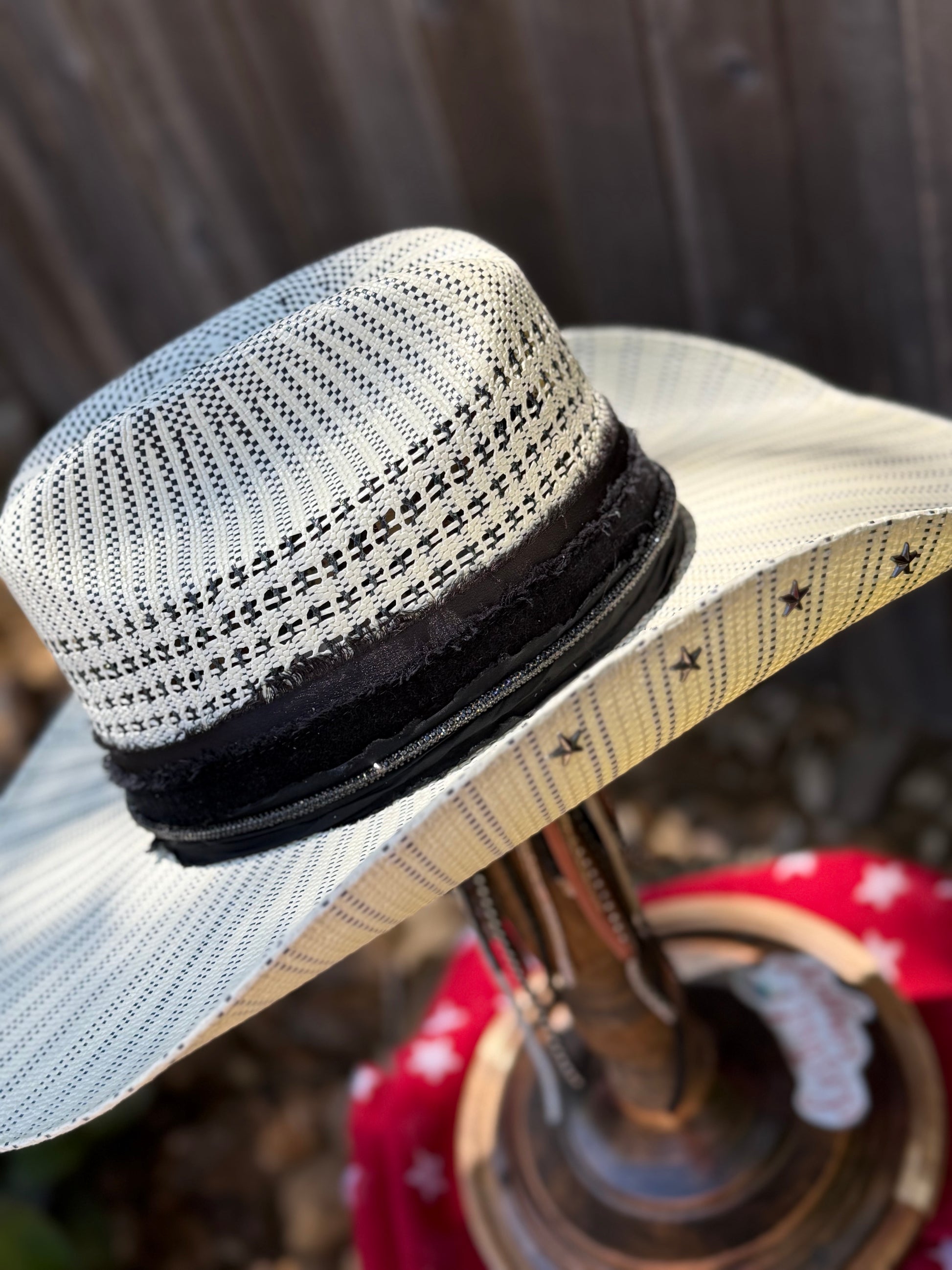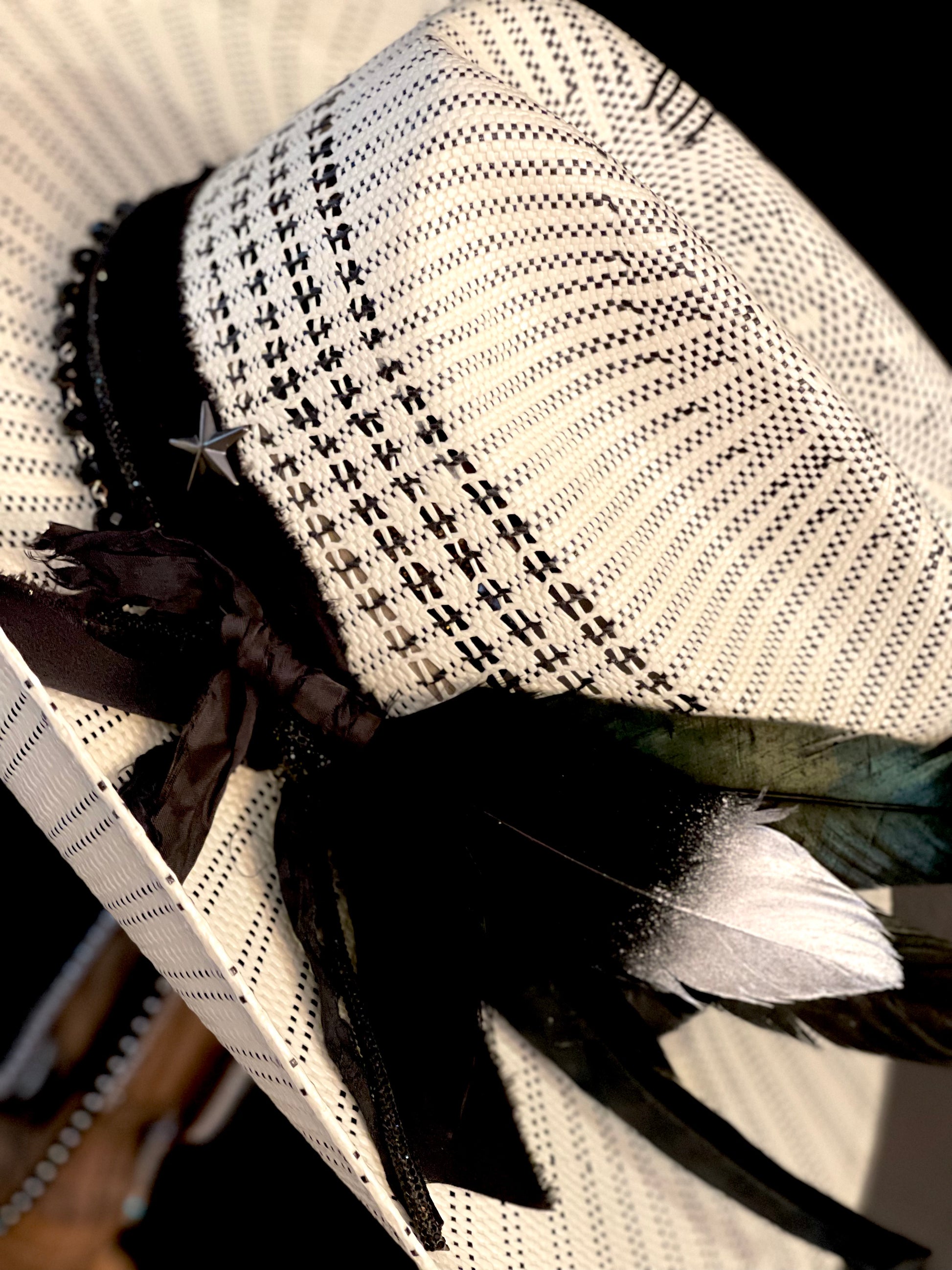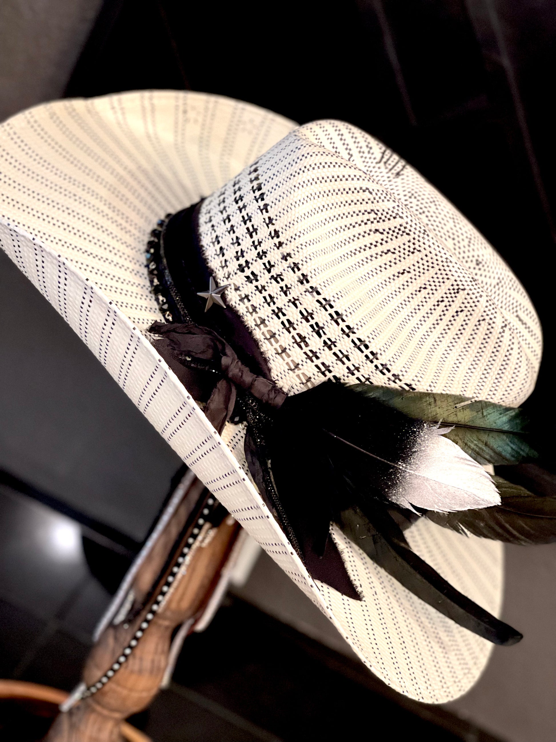 This is the ONE!! Just added and will sell out FAST! The Raven - as seen on my social media stores/post. All black custom straw hat with layered black ribbons, black beads, stars, and custom black feather clip. Did you notice the stars on the brim?!?! (Feather clip makes it easy to add/change/remove feathers from any hat.)
