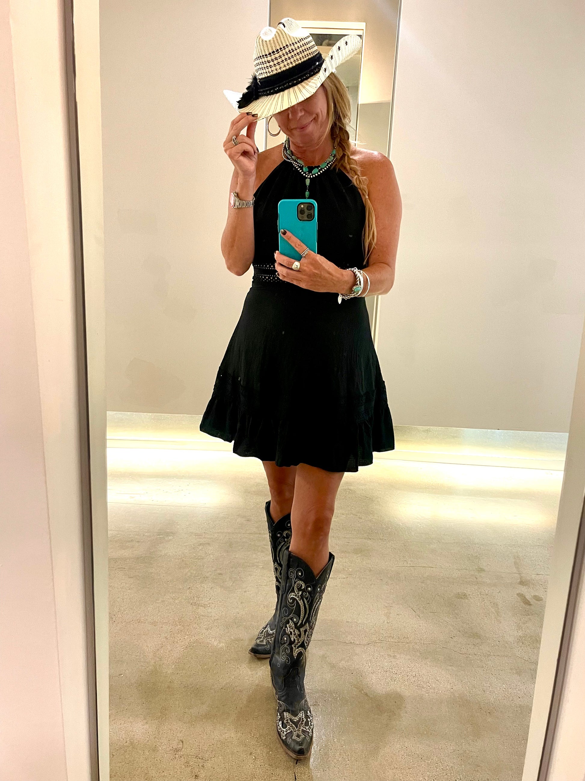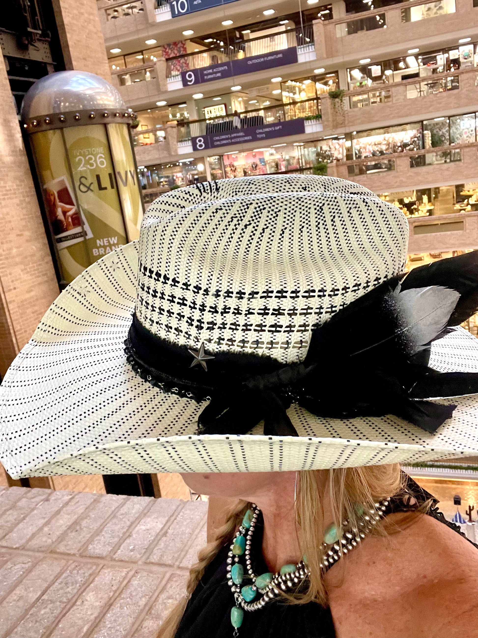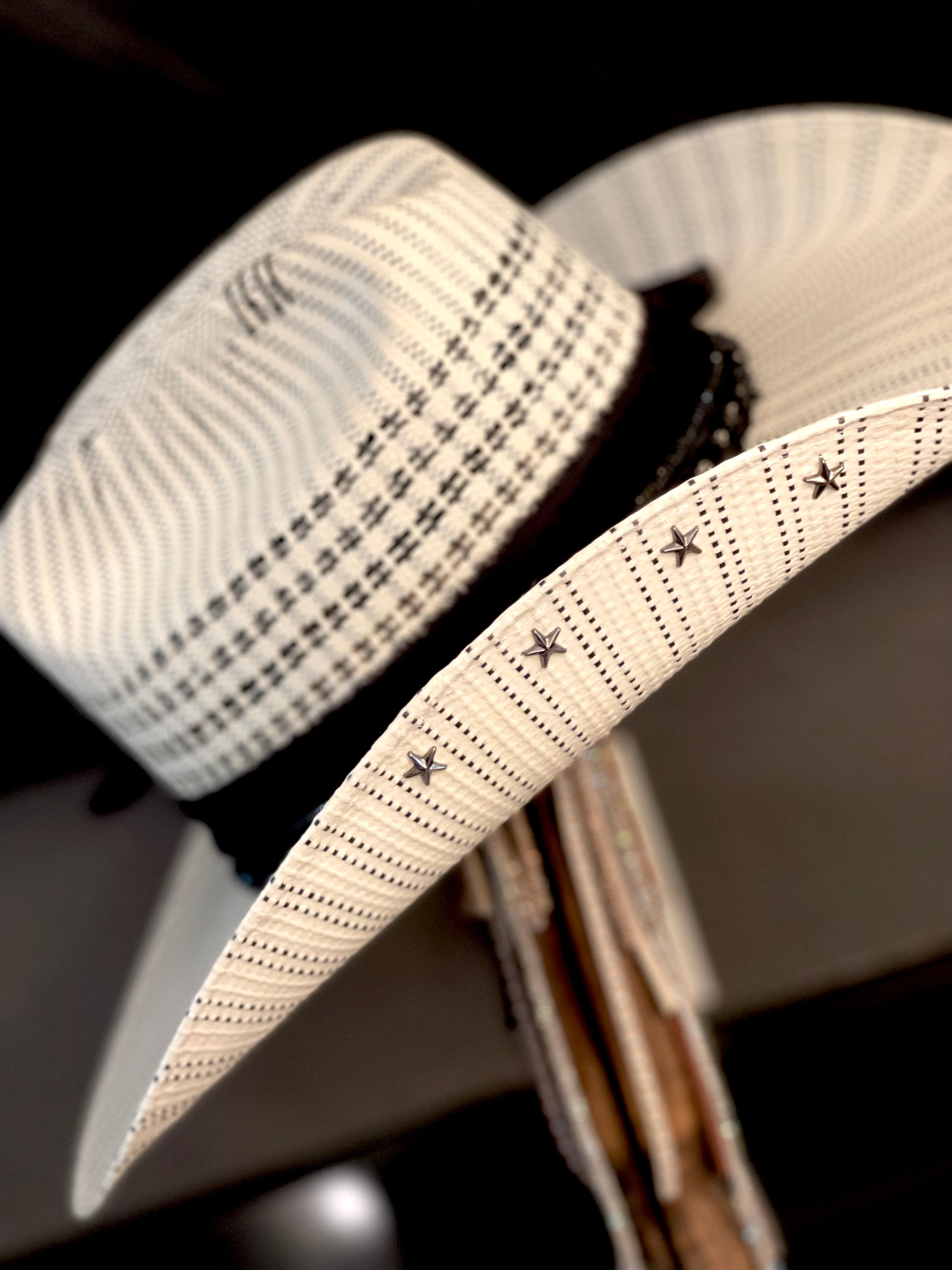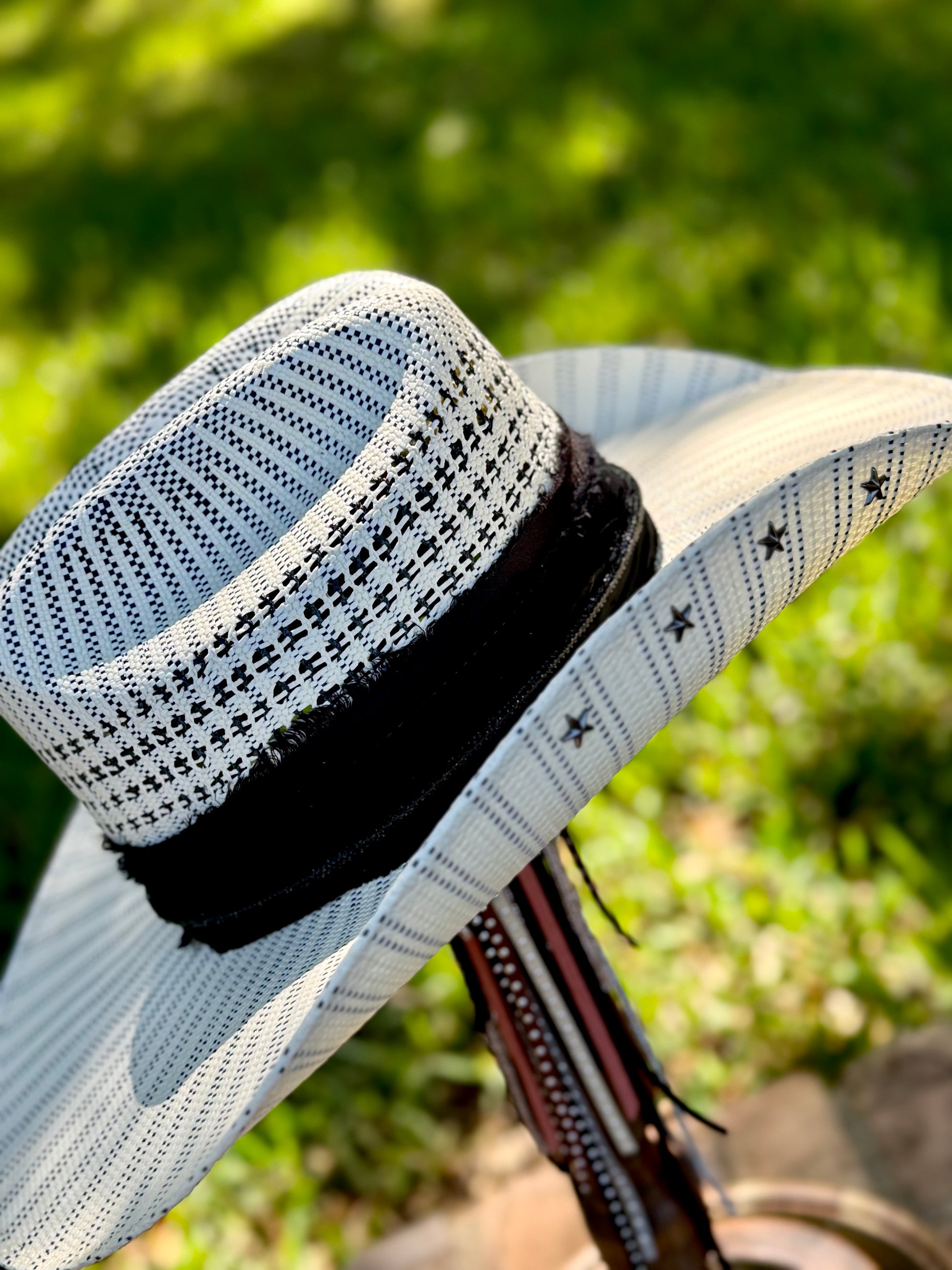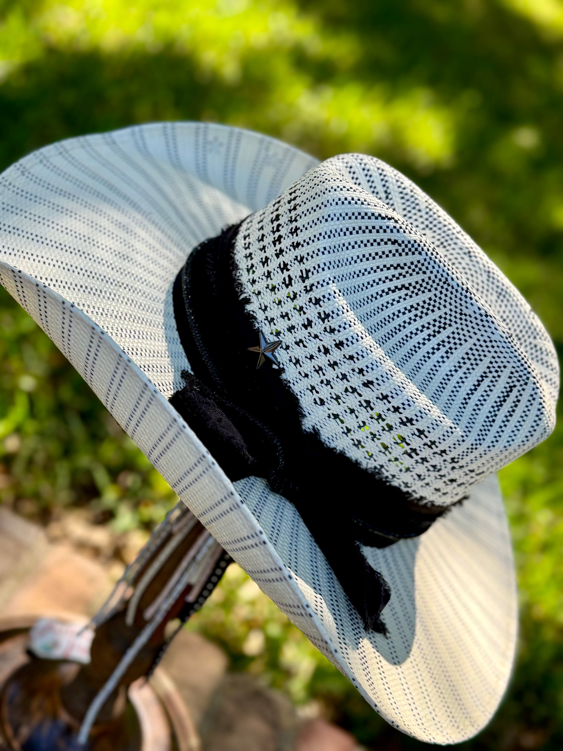 This is the ONE!! Just added and will sell out FAST! The Raven - as seen on my social media stores/post. All black custom straw hat with layered black ribbons, black beads, stars, and custom black feather clip. Did you notice the stars on the brim?!?! (Feather clip makes it easy to add/change/remove feathers from any hat.)