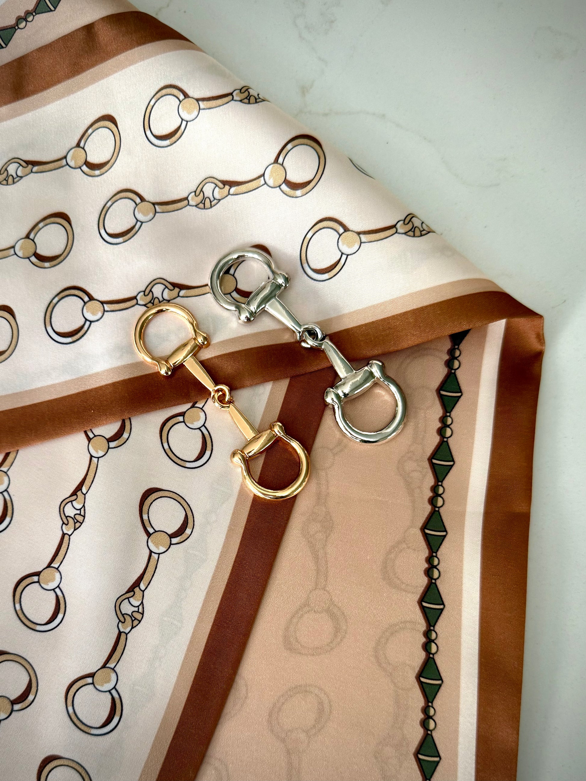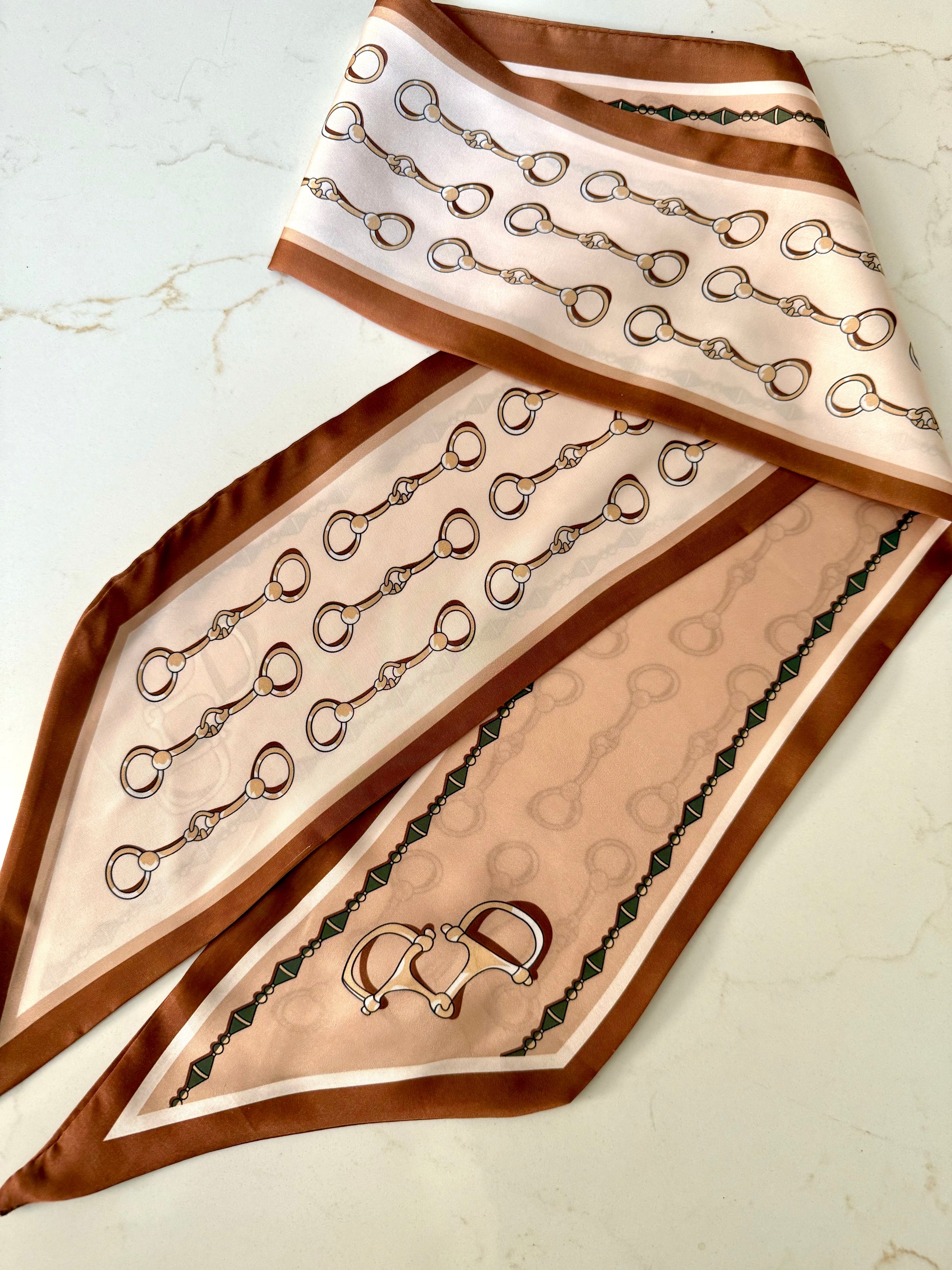 Silky and satin scarf with a classic equestrian pattern. It is sure to add a bright pop of color to any outfit or to wrap your purse strap.